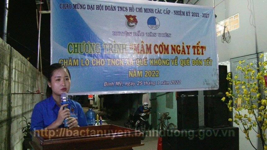 Phát biểu tại chương trình, đồng chí Hồ Thị Thanh Tuyền - Phó Bí thư Huyện đoàn cho rằng thanh niên công nhân (TNCN) có đóng góp rất lớn đến với sự phát triển chung của huyện nhà. Xác định được vai trò quan trọng đó, thời gian qua cùng với các cấp chính quyền trong huyện, các ban ngành đoàn thể huyện luôn dành sự quan tâm đặc biệt, tổ chức nhiều hoạt động thiết thực chăm lo đến đời sống vật chất và tinh thần cho TNCN như chương trình khám bệnh, phát thuốc miễn phí, chương trình tặng quà cho TNCN có hoàn cảnh khó khăn, chương trình Xuân Yêu Thương phục vụ văn nghệ cho TNCN, chương trình tuyên truyền tư vấn pháp luật miễn phí cho TNCN, sân chơi cuối tuần phục vụ TNCN. Tiếp nối những hoạt động đó, Huyện Đoàn Bắc Tân Uyên phối hợp Ban tổ chức đề án Thanh niên công nhân xã Bình Mỹ tổ chức chương trình mâm cơm ngày tết chăm lo cho thanh niên công nhân năm 2022 với những hoạt động thiết thực. Thay mặt Ban Thường vụ Huyện đoàn, đồng chí Hồ Thị Thanh Tuyền cũng đã chúc các bạn thanh niên công nhân và công nhân trên địa bàn xã có một cái Tết thật là hạnh phúc, an khang, vạn sự như ý.