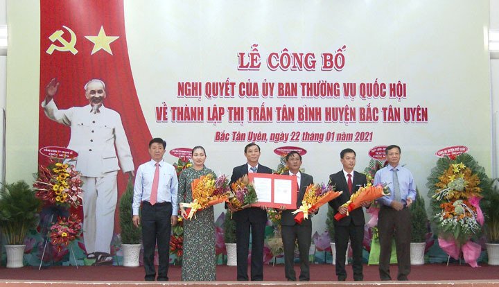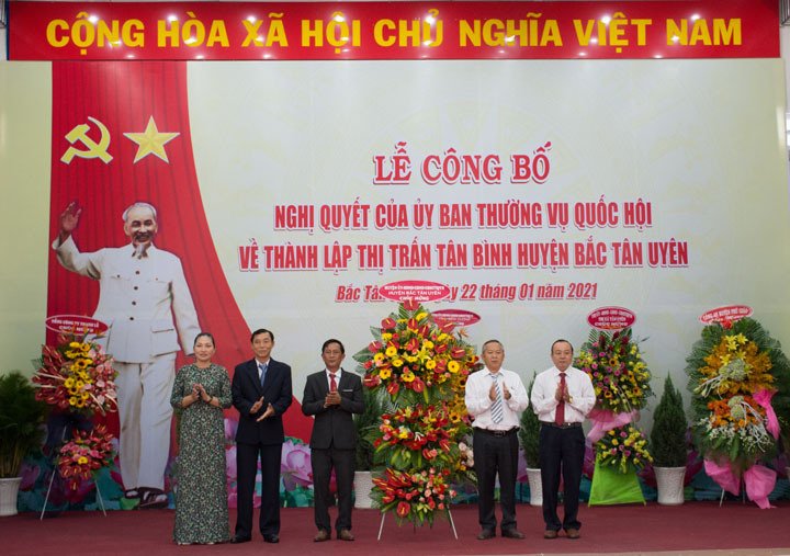 Sáng ngày 22/1, UBND huyện Bắc Tân Uyên tổ chức lễ công bố Nghị quyết của Uỷ ban Thường vụ Quốc hội về thành lập thị trấn Tân Bình. Đến dự có ông Võ Văn Bá - Uỷ viên thường vụ, Trưởng ban Nội chính Tỉnh uỷ; ông Nguyễn Thanh Trúc - Phó chủ tịch UBND tỉnh; ông Trần Thanh Liêm - Nguyên Phó Bí thư Tỉnh uỷ, nguyên Chủ tịch UBND; ông Thái Thanh Bình - Tỉnh ủy viên-Bí thư Huyện ủy-Chủ tịch UBND huyện, ông Lê Văn Quý - Ủy viên Thường vụ-Phó Chủ tịch HĐND huyện, ông Trần Văn Phương - Ủy viên Thường vụ-Phó Chủ tịch UBND huyện, các đồng chí lãnh đạo tỉnh, huyện qua các thời kỳ, lãnh đạo các ban, ngành, đoàn thể huyện, lãnh đạo Đảng ủy-HĐND-UBND-UBMTTQ VN xã cùng đông đảo bà con nhân dân xã Tân Bình.