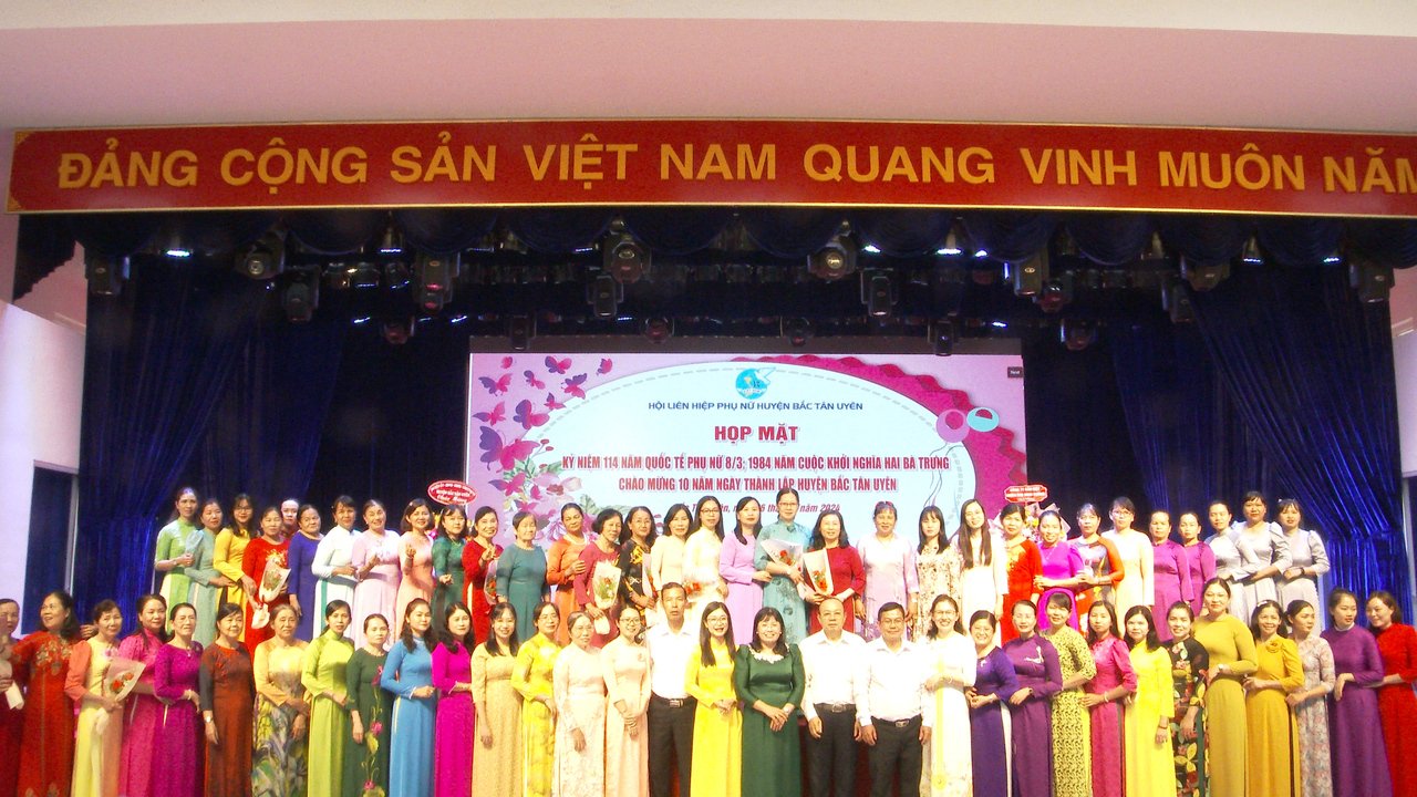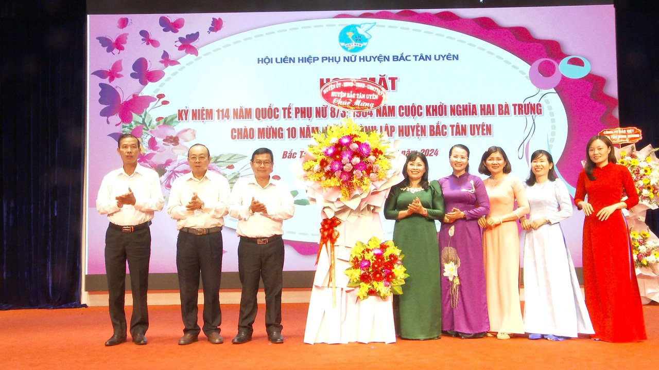 Sáng 06/3, tại Trung tâm Hội nghị huyện Bắc Tân Uyên, Hội LHPN huyện Bắc Tân Uyên tổ chức Họp mặt Kỷ niệm 114 năm Ngày Quốc tế Phụ nữ (08-3-1910/08-3-2024), 1984 năm Cuộc khởi nghĩa Hai Bà Trưng và chào mừng ngày thành lập huyện Bắc Tân Uyên 01/4/2014.