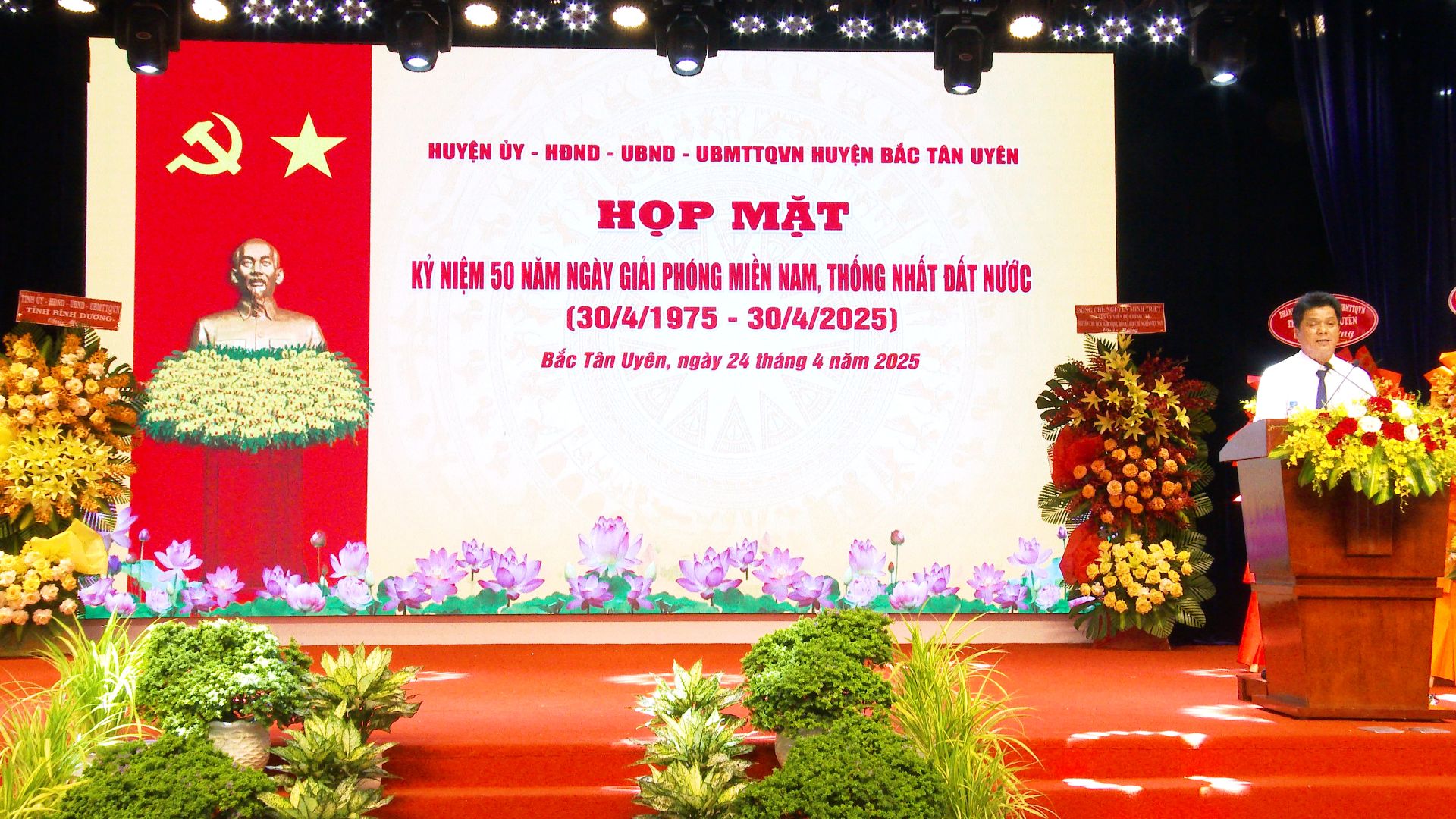 Tại buổi họp mặt, các đại biểu đã nghe đồng chí Nguyễn Thành Thường-Phó Bí thư Huyện ủy-Chủ tịch UBND huyện đọc diễn văn ôn lại truyền thống những ngày tháng 4 lịch sử. Ngày 30/4/1975 đã đi vào lịch sử dân tộc như một mốc son chói lọi. Theo đó, cách đây vừa tròn 50 năm, cuộc Tổng tiến công và nổi dậy Mùa Xuân năm 1975 diễn ra ác liệt, thần tốc trong 55 ngày đêm chiến đấu (từ ngày 04/3 đến ngày 30/4/1975), với sức mạnh áp đảo về chính trị và quân sự, với phương châm thần tốc, táo bạo, bất ngờ, chắc thắng, quân và dân ta đã giành được toàn thắng trên các chiến trường. Cũng trong những giờ phút lịch sử của tháng 4 năm ấy, Đảng bộ, quân và dân toàn Tỉnh nói chung và huyện Bắc Tân Uyên nói riêng, sục sôi khí thế cách mạng quyết tâm "giành chính quyền về tay nhân dân". Bắc Tân Uyên - chiến khu Đ, trở thành nơi tập kết của khối chủ lực tấn công vào Sài Gòn trên hướng Bắc. Quán triệt phương châm "huyện giải phóng huyện, xã giải phóng xã", quân và dân Huyện nhà đã kiên cường đấu tranh gìn giữ, bám trụ địa bàn, phối hợp chặt chẽ với các đơn vị lực lượng của Tỉnh và bộ đội chủ lực tấn công và đánh bại các kế hoạch bình định, lấn chiếm của địch, giữ vững và mở rộng vùng căn cứ phía sau, tạo bàn đạp phía trước, tiến lên và tiêu diệt hoàn toàn sinh lực địch, giành chính quyền về tay nhân dân, góp phần giải phóng hoàn toàn Tỉnh cũng như toàn miền, thống nhất đất nước. Trong niềm vui chung của dân tộc, niềm hân hoan của cả nước nhân ngày thống nhất, có sự hy sinh và đóng góp không nhỏ của quân và dân chiến khu Đ anh hùng. Nửa thế kỷ - một chặng đường lịch sử đủ dài để chúng ta nhìn lại và tự hào về quá khứ hào hùng, vẻ vang của Đại thắng Mùa xuân năm 1975, giây phút non sông nối liền một dải, Bắc - Nam sum họp một nhà.