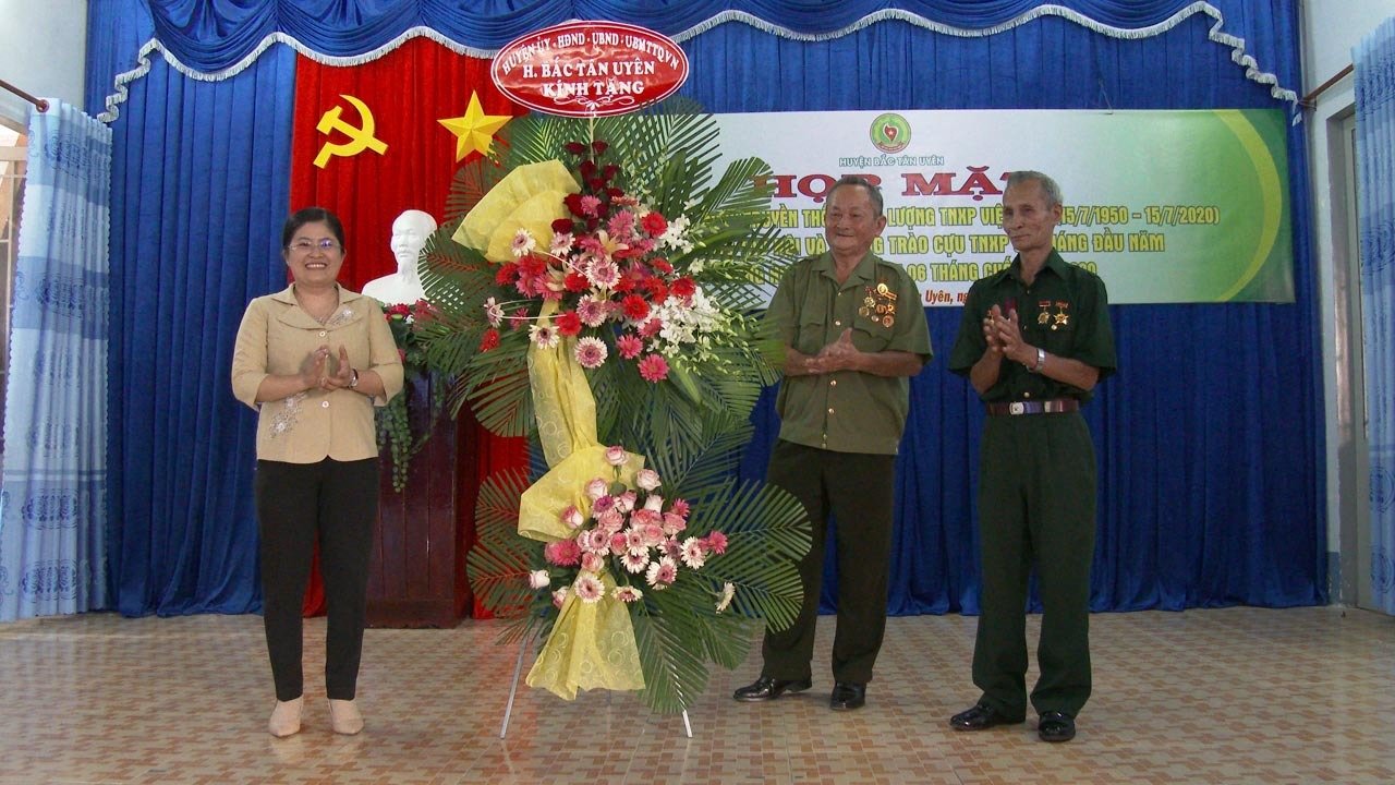 Bà Lê Thị Anh Đào - Phó ban Dân vận Huyện ủy Bắc Tân Uyên tặng lẵng hoa chúc mừng cho Hội Cựu TNXP huyện