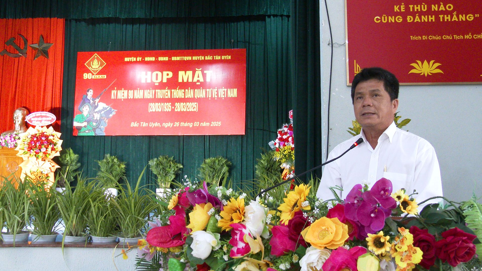 Sáng ngày 26/3, Huyện ủy-HĐND-UBND-UBMTTQ Việt Nam huyện Bắc Tân Uyên tổ chức họp mặt kỷ niệm 90 năm ngày truyền thống Lực lượng dân quân tự vệ Việt Nam 28/3/1935-28/3/2025. Dự buổi họp mặt có đại tá Trần Văn Hùng-Phó Chính ủy Bộ chỉ huy quân sự tỉnh, đồng chí Nguyễn Thành Thường-Phó Bí thư Huyện ủy-Chủ tịch UBND huyện, đồng chí Nguyễn Hữu Lộc-Nguyên Tỉnh ủy viên-Nguyên bí thư Huyện ủy Bắc Tân Uyên; Thượng tá Nguyễn Phương Khánh-UVTV Huyện uỷ- Chỉ huy trưởng Ban chỉ huy quân sự huyện; lãnh đạo các ban, ngành, đoàn thể huyện; lãnh đạo các xã, thị trấn, các trường THPT trên địa bàn huyện.
