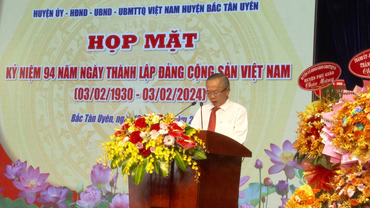 Tại buổi họp mặt, các đại biểu đã ôn lại truyền thống và sự phát triển của Đảng ta trong suốt 94 năm qua; truyền thống anh hùng của toàn Đảng, toàn quân và dân tỉnh Bình Dương nói chung và vùng đất chiến khu Đ huyện Bắc Tân Uyên nói riêng trong suốt 2 cuộc kháng chiến chống thực dân Pháp và đế quốc Mỹ xâm lược. Phát huy truyền thống, trong những năm qua Đảng bộ và nhân dân huyện Bắc Tân Uyên đã vươn lên về mọi mặt. Năm 2023, Huyện ủy Bắc Tân Uyên đã tăng cường công tác lãnh đạo, chỉ đạo cả hệ thống chính trị, tập trung thực hiện đạt và vượt các chỉ tiêu, nhiệm vụ đề ra. Cụ thể, giá trị sản xuất nông nghiệp thực hiện được 2.904 tỷ đồng, tăng 4,65%, giá trị sản xuất công nghiệp thực hiện được 6.047 tỷ đồng, tăng 11,32%. Tổng mức bán lẻ hàng hoá và doanh thu dịch vụ đạt 5.567 tỷ đồng, tăng 14,57%. Tổng thu ngân sách nhà nước thực hiện được 1.851 tỷ đồng, tăng 9%. Công tác đảm bảo an sinh xã hội, chăm lo gia đình chính sách được quan tâm. An ninh chính trị và TTATXH được giữ vững. Cùng với đó, công tác xây dựng, chỉnh đốn Đảng và hệ thống chính trị cũng được triển khai thực hiện đảm bảo.