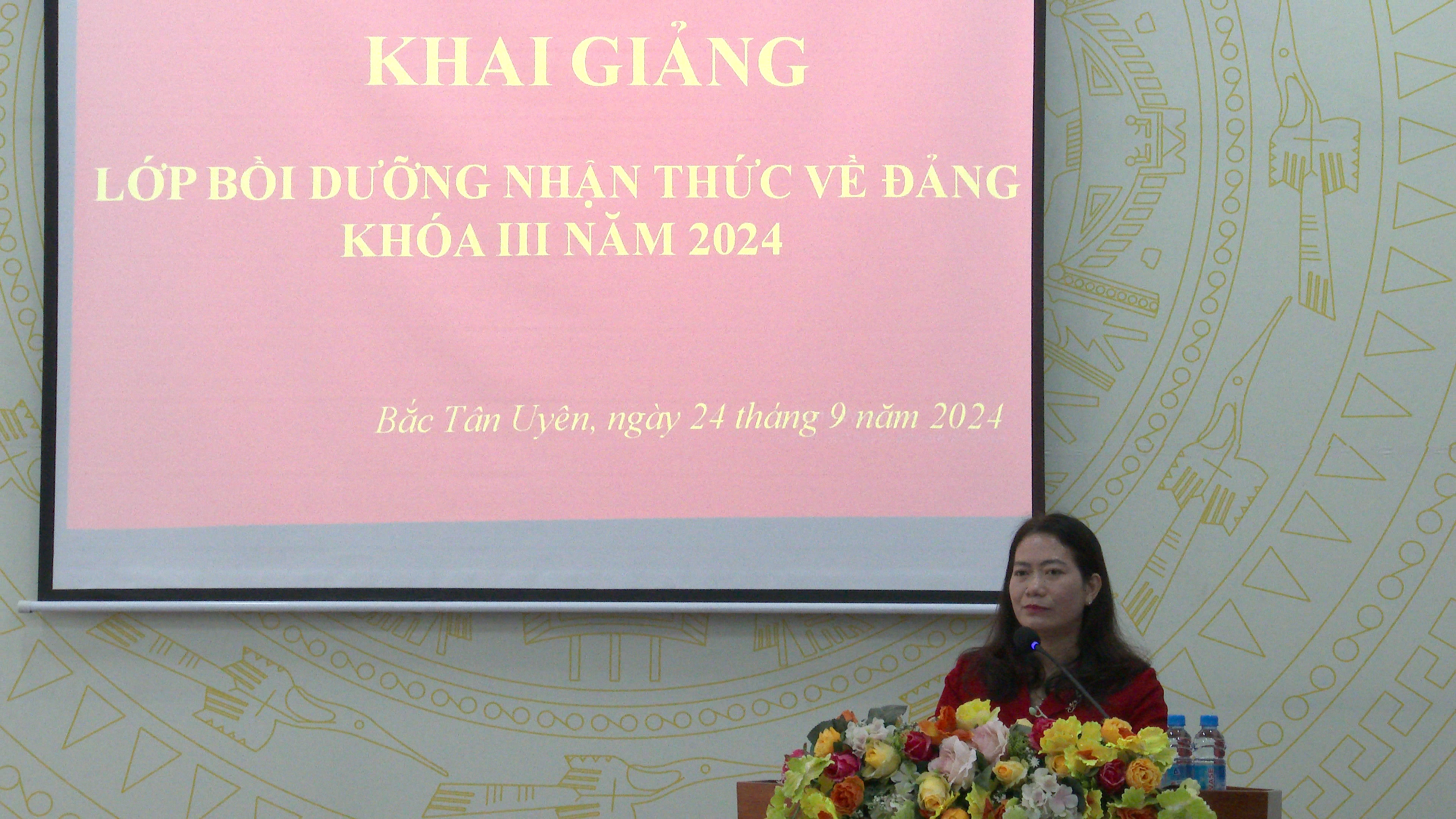 Sáng ngày 24/9, Trung tâm Chính trị huyện Bắc Tân Uyên tổ chức khai giảng lớp bồi dưỡng nhận thức về Đảng khóa III năm 2024 cho 76 học viên là cán bộ, đoàn viên, quần chúng ưu tú của các tổ chức chính trị - xã hội và nguồn thanh niên nhập ngũ trên địa bàn huyện. Dự buổi khai giảng có bà Hồ Thị Liễu - Phó Giám đốc Trung tâm Chính trị huyện, ông Nguyễn Văn Quân - Phó ban Tổ chức Huyện ủy.