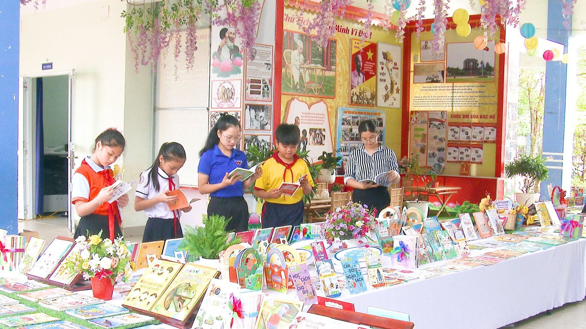 Ngay từ sáng sớm, không gian xung quanh sân trường đã được trang hoàng đẹp mắt. Các gian trưng bày sách được bố trí khoa học, hấp dẫn với những mô hình sách nghệ thuật được sắp xếp khoa học. Các học sinh đã được trải nghiệm không gian đọc sách tự do với sự phong phú của hơn 400 đầu sách các loại, từ sách thiếu nhi, sách giáo khoa đến những cuốn sách khoa học, văn học hay lịch sử, giúp các em mở rộng tầm hiểu biết về thế giới xung quanh. Ngoài ra trong Ngày Hội, BTC còn tổ chức triển lãm tranh ảnh về giai đoạn kháng chiến nhân dịp kỷ niệm 50 năm Ngày Giải phóng Miền Nam (30/4/1975- 30/4/2025), trưng bày những hình ảnh sống động về giai đoạn lịch sử quan trọng của dân tộc. Những bức ảnh đen trắng ghi lại hình ảnh các chiến sĩ kiên cường trên mặt trận, những khoảnh khắc quyết liệt của cuộc kháng chiến chống Mỹ cứu nước, cùng với những bức tranh mô tả cuộc sống kháng chiến khó khăn của Nhân dân đã thu hút sự chú ý của các em học sinh.