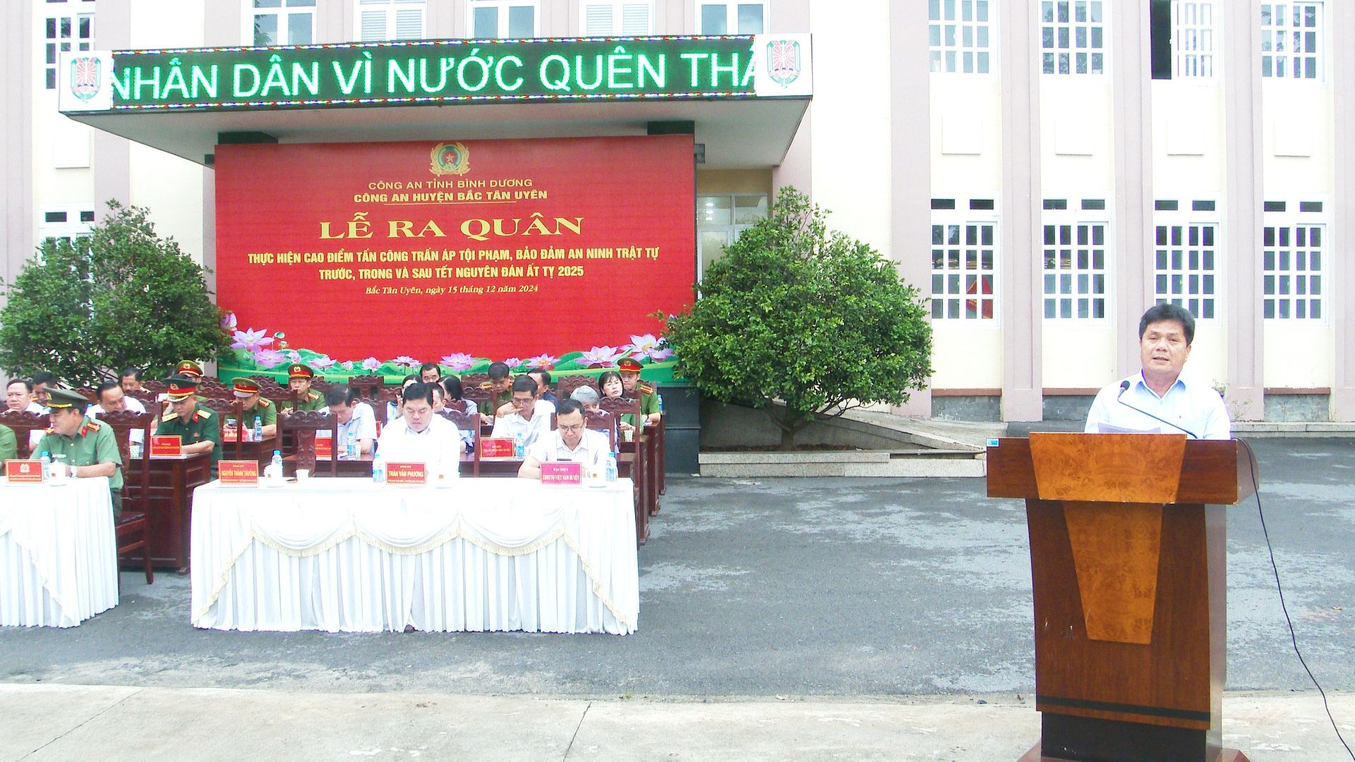 Sáng ngày 15/12, Công an huyện Bắc Tân Uyên tổ chức Lễ ra quân thực hiện cao điểm tấn công trấn áp tội phạm, bảo đảm an ninh, trật tự dịp tết Nguyên đán Ất Tỵ 2025. Dự lễ phát động có ông Nguyễn Thành Thường - Phó Bí thư Huyện ủy - Chủ tịch UBND huyện, ông Trần Văn Phương - Ủy viên Thường vụ Huyện ủy - Phó Chủ tịch UBND huyện - Trưởng Ban Chỉ đạo 138 huyện; Thượng tá Võ Thành Trung - Ủy viên Thường vụ Huyện uỷ, Trưởng Công an huyện cùng lãnh đạo, các Đội nghiệp vụ, cán bộ, chiến sĩ công an huyện, quân sự huyện; lãnh đạo các ngành, đoàn thể huyện, Trưởng công an các xã, thị trấn trên địa bàn huyện.