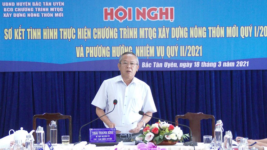 Sáng ngày 18/3, Ban chỉ đạo Chương trình Mục tiêu Quốc gia xây dựng Nông thôn mới huyện Bắc Tân Uyên tổ chức cuộc họp nhằm sơ kết công tác xây dựng Nông thôn mới quý I, triển khai phương hướng, nhiệm vụ quý II năm 2021. Ông Thái Thanh Bình - Tỉnh Ủy viên-Bí thư Huyện ủy-Chủ tịch UBND huyện-Trưởng Ban chỉ đạo Chương trình MTQG xây dựng Nông thôn mới huyện chủ trì cuộc họp; dự cuộc họp có lãnh đạo các cơ quan, ngành, đoàn thể là thành viên BCĐ huyện, trưởng BCĐ các xã.