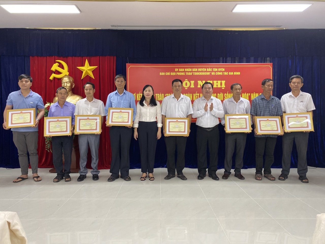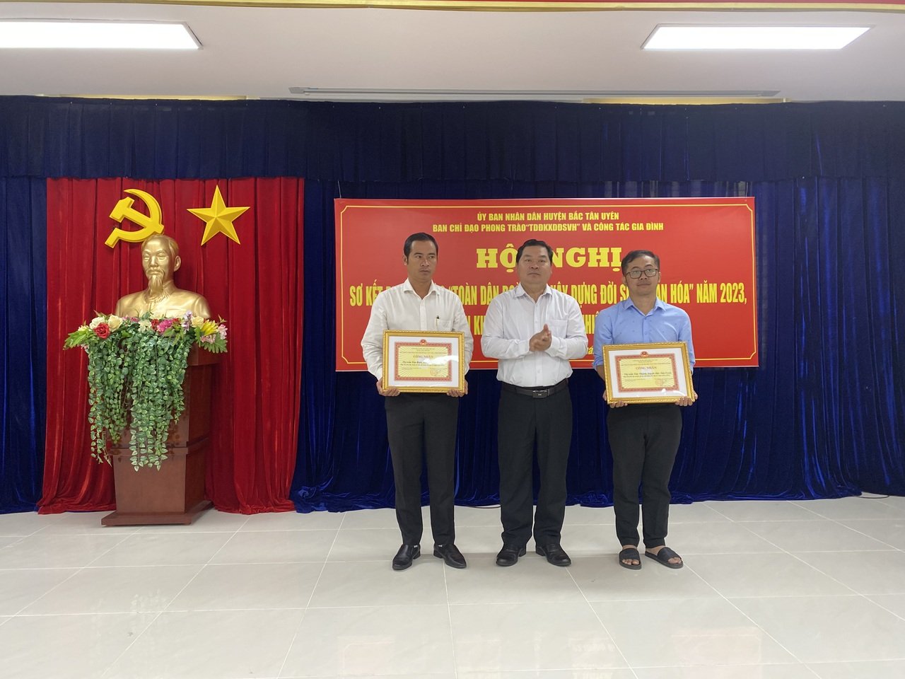 Dịp này, ban chỉ đạo phong trào toàn dân đoàn kết xây dựng đời sống văn hóa huyện đã trao Danh hiệu Thị trấn đạt chuẩn đô thị văn minh lần đầu 2 năm 2022-2023 cho 2 thị trấn Tân Bình và Tân Thành; trao giấy khen của Chủ tịch UBND huyện cho 10 khu phố, ấp có thành tích xuất sắc, tiêu biểu trong xây dựng khu dân cư văn hóa 5 năm liên tục 2019-2023.
