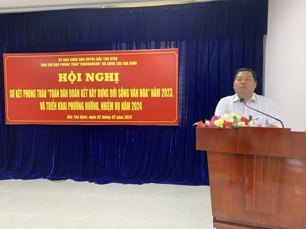 Dự và phát biểu tại hội nghị, ông Trần Văn Phương-Ủy viên thường vụ Huyện ủy-Phó Chủ tịch UBND huyện-Trưởng ban chỉ đạo phong trào toàn dân đoàn kết xây dựng đời sống văn hóa huyện đánh giá cao vai trò, trách nhiệm của các cơ quan, ban ngành, các cấp, đặc biệt là các khu phố, ấp trong triển khai thực hiện phòng trào toàn dân đoàn kết xây dựng đời sống văn hóa; qua đó giúp cho huyện Bắc Tân Uyên được nhận cờ thi đua của tỉnh là đơn vị dẫn đầu phong trào thi đua các huyện phía bắc của tỉnh.