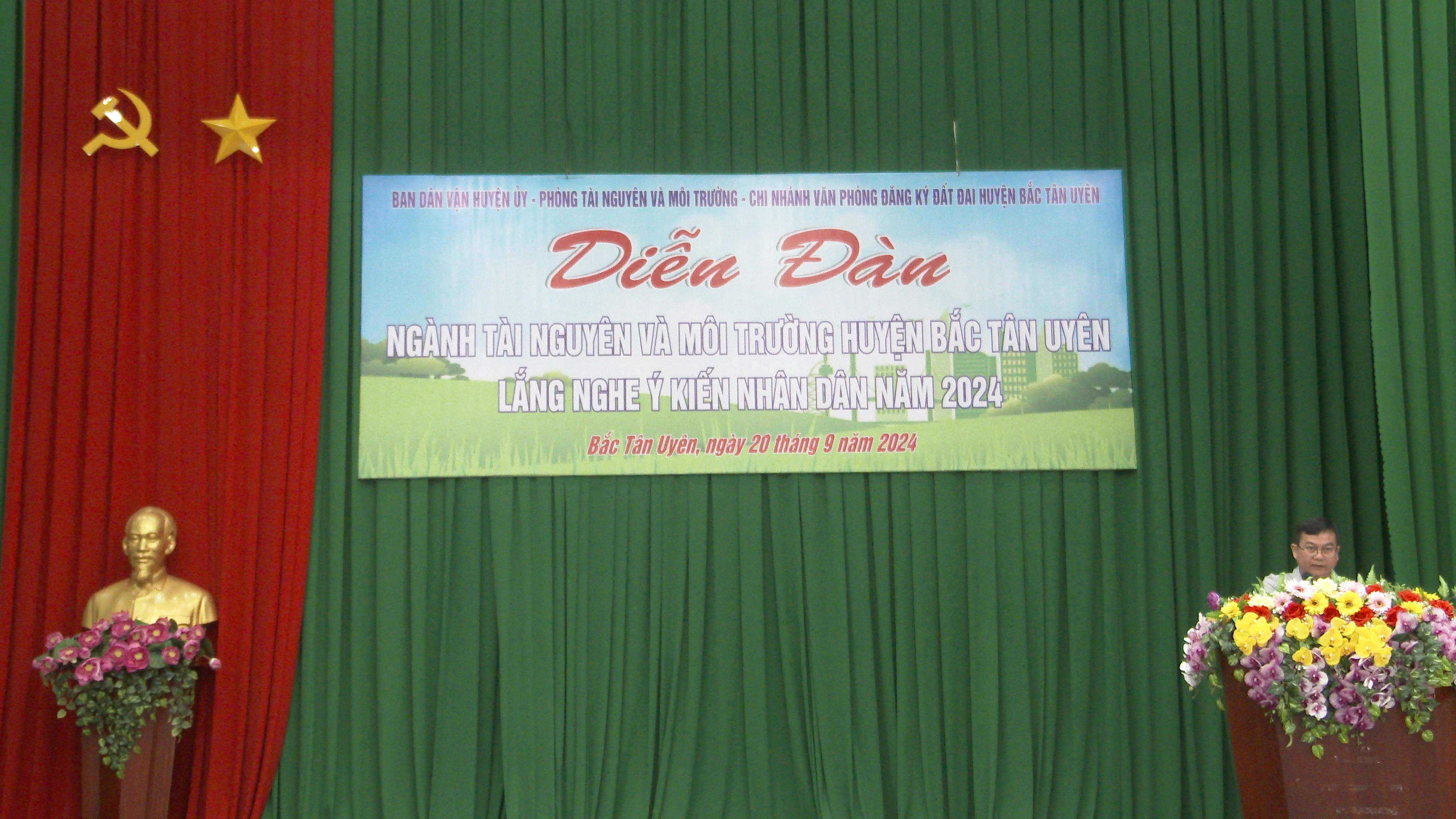 Phát biểu khai mạc diễn đàn, ông Phạm Văn An - Ủy viên Thường vụ - Trưởng Ban Dân vận Huyện ủy cho rằng việc tổ chức diễn đàn có ý nghĩa hết sức cần thiết để ngành tài nguyên và môi trường lắng nghe những ý kiến đóng góp cho cán bộ, công chức ngành trong qua trình thực hiện nhiệm vụ cũng như công tác quản lý của huyện; đồng thời trao đổi những thuận lợi, khó khăn trong lãnh đạo, chỉ đạo, quản lý điều hành để người dân hiểu và đồng thuận, cùng chung tay góp phần cho sự phát triển kinh tế - xã hội, quốc phòng - an ninh của huyện trong thời gian tới.