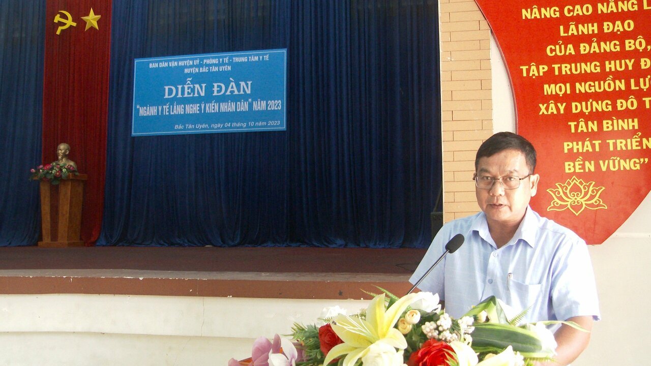 Sáng ngày 04/10, tại Trung tâm Văn hóa Thể thao và Học tập cộng đồng thị trấn Tân Bình, Ban Dân vận Huyện ủy Bắc Tân Uyên, Phòng Y tế và Trung tâm Y tế huyện phối hợp tổ chức diễn đàn Ngành y tế lắng nghe ý kiến nhân dân năm 2023. Tham dự diễn đàn có ông Huỳnh Minh Chính-Phó Giám đốc Sở y tế tỉnh, bà Lê Minh Lý-Giám đốc Bảo hiểm y tế tỉnh, ông Võ Văn Tính-Phó Bí thư Thường trực Huyện ủy-Chủ tịch HĐND huyện, ông Phạm Văn An-UVTV-Trưởng ban Dân vận-Chủ tịch UB MTTQ VN huyện, ông Trần Văn Phương-UVTV-Phó Chủ tịch UBND huyện, bà Thượng Thị Hồng Thơm-Trưởng phòng Y tế huyện, ông Nguyễn Văn Thệ-Giám đốc Trung tâm Y tế huyện, lãnh đạo các ngành, đoàn thể huyện; lãnh đạo Đảng ủy, UBND, UBMTTQ, Trưởng ban chỉ đạo Chương trình mục tiêu y tế dân số, trạm Y tế các xã, thị trấn trên địa bàn huyện, đại diện các cơ sở ngành nghề y tế tư nhân, nhân dân trên địa bàn thị trấn Tân Bình và xã Bình Mỹ.