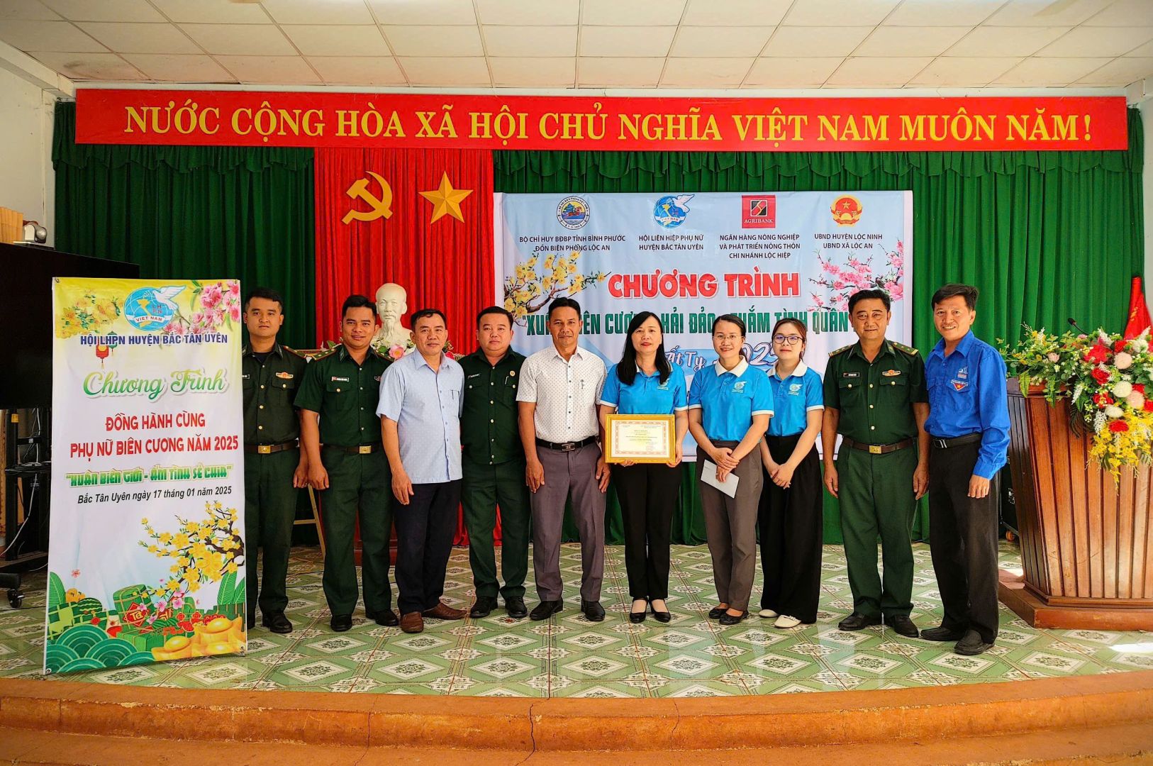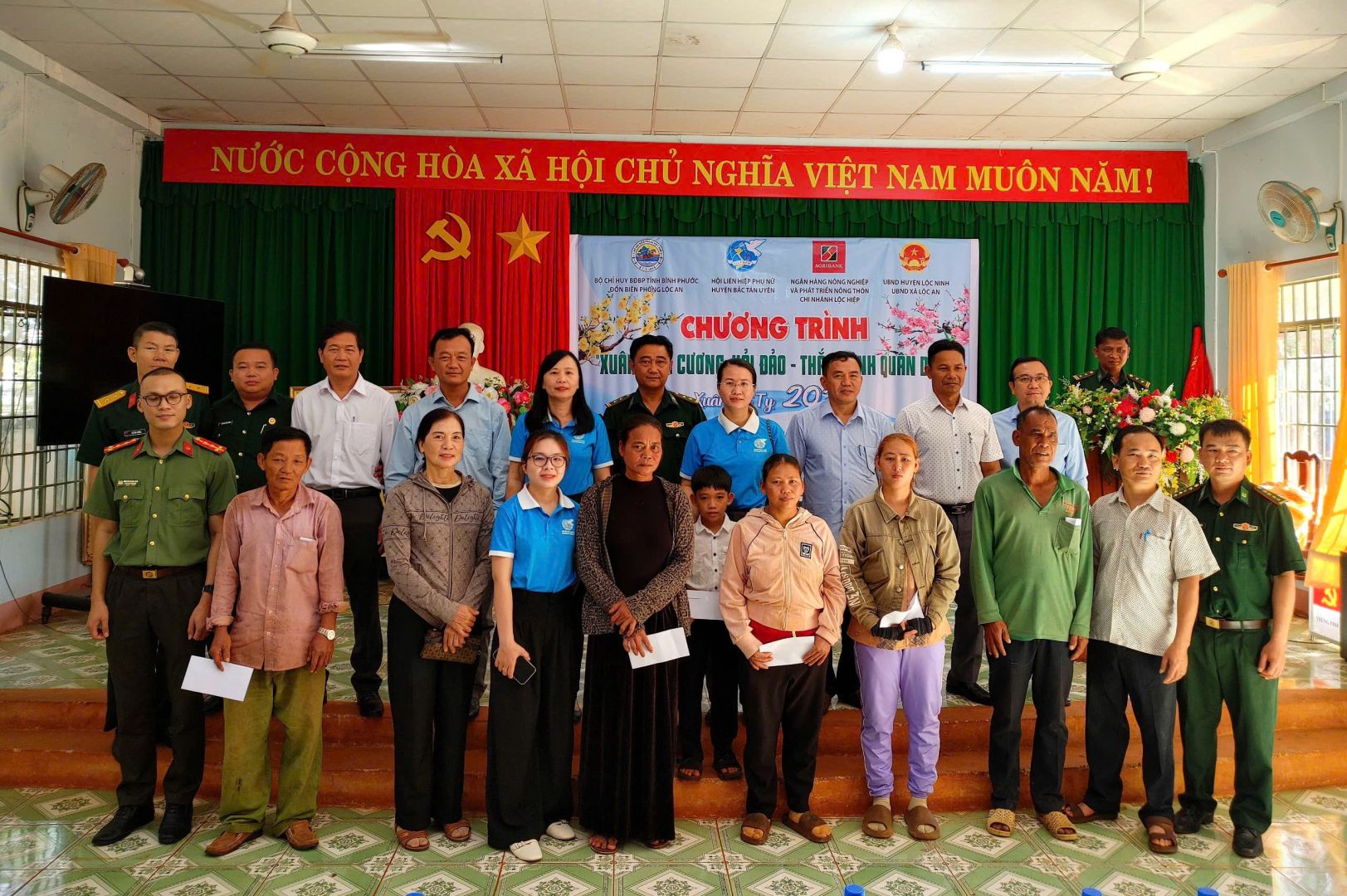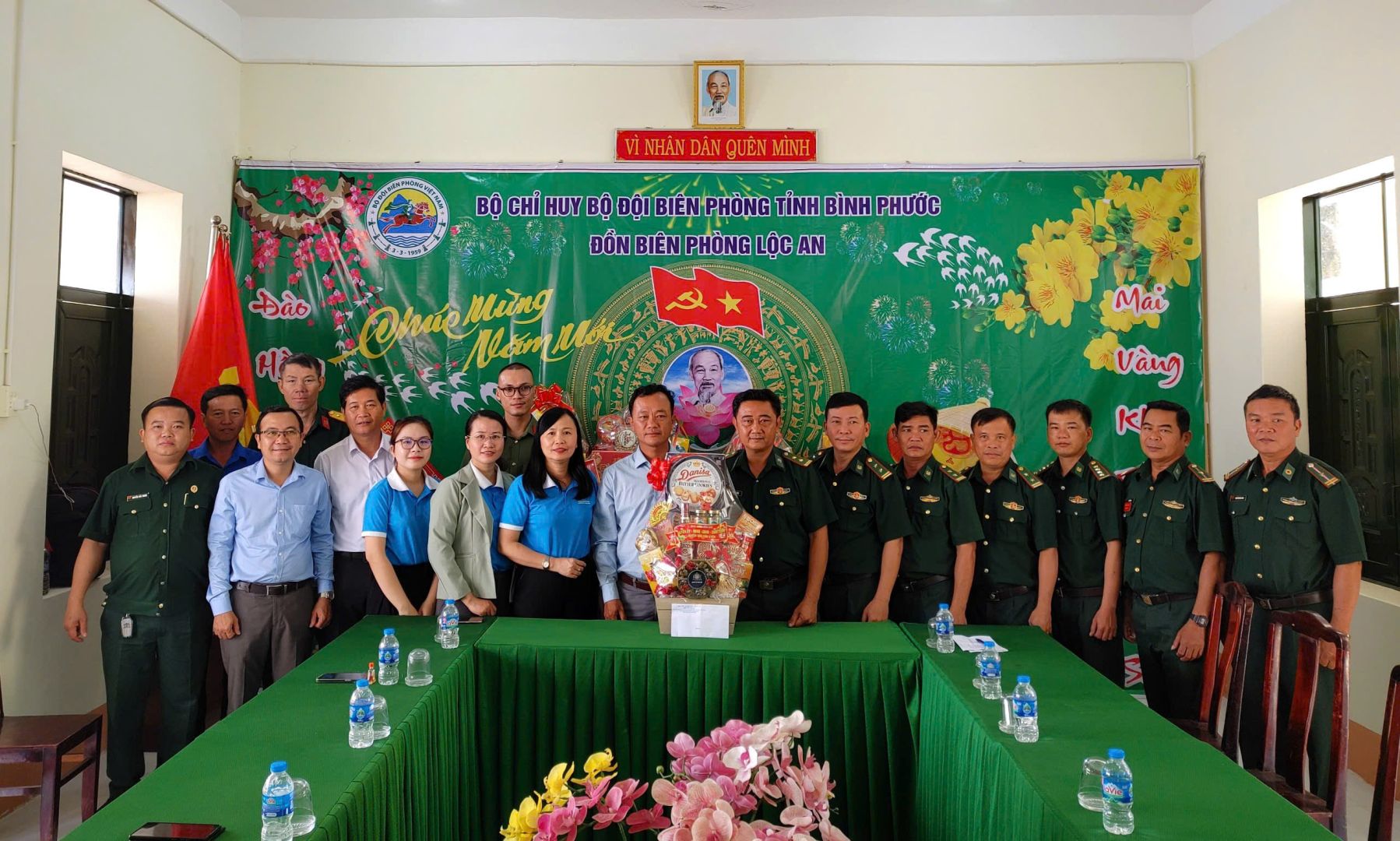 Hành trình Xuân Biên Cương năm nay, đoàn đã đến thăm chúc mừng năm mới các chiến sĩ, bà con đồng bào, các em thiếu nhi tại đồn Biên phòng Lộc An, xã Lộc An, huyện Lộc Ninh, tỉnh Bình Phước. Trao tặng 30 phần quà cho hộ gia đình phụ nữ đồng bào dân tộc có hoàn cảnh khó khăn trị giá 15 triệu đồng. Những phần quà gửi tặng đến các chiến sĩ, đồng bào tại nơi đây thể hiện sự tri ân sự đóng góp thầm lặng, dũng cảm của lực lượng biên phòng; sự sẻ chia với những khó khăn của bà con đồng bào và tiếp tục góp phần chắp cánh ước mơ “Nâng bước em đến trường” cho các em thiếu nhi vùng biên giới có hoàn cảnh đặc biệt khó khăn nơi đây.