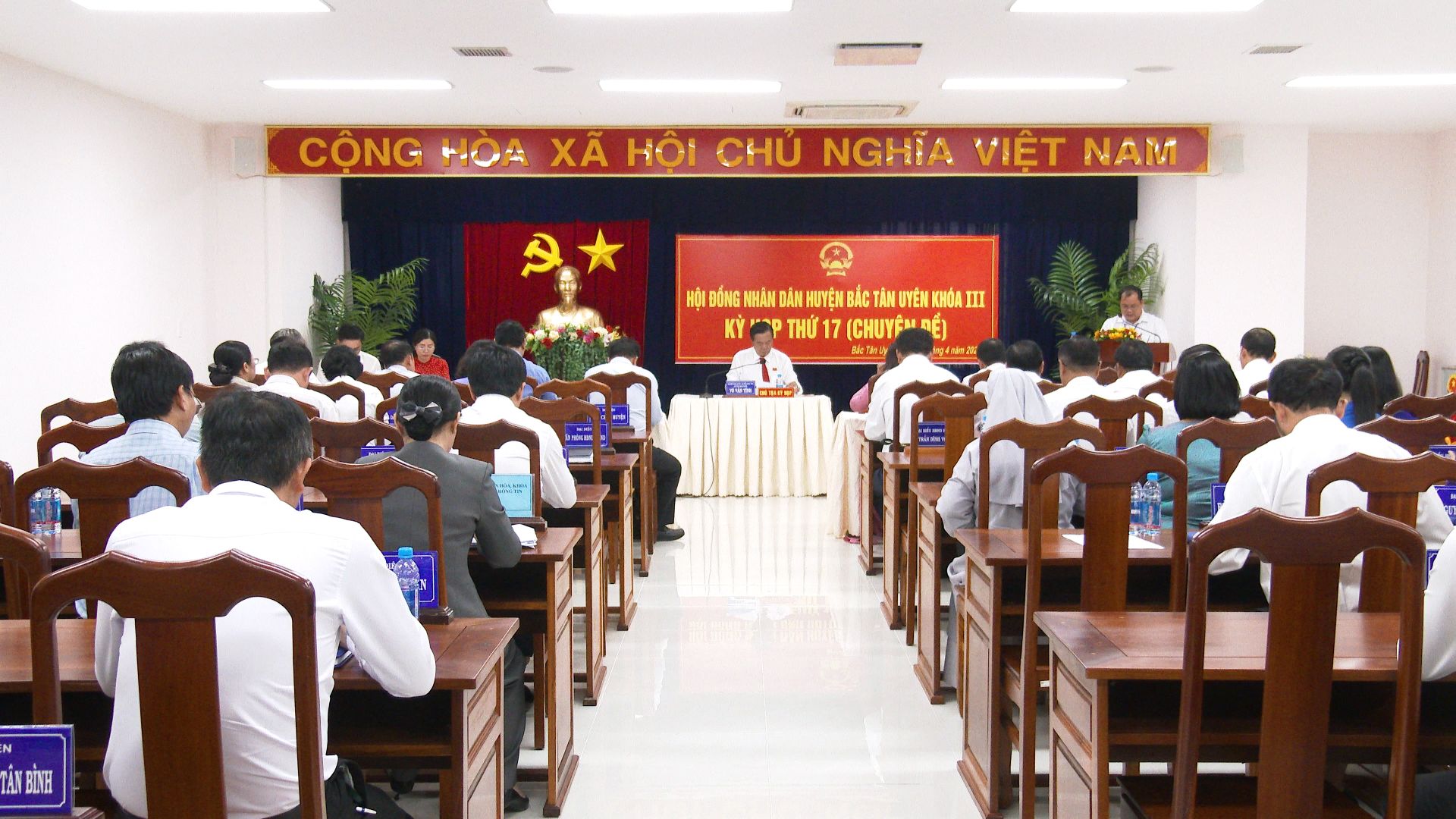 Chiều ngày 21/4, Hội đồng nhân dân huyện Bắc Tân Uyên tổ chức kỳ họp HĐND huyện lần thứ 7 chuyên đề. Dự kỳ họp có ông Võ Văn Tính-Phó Bí thư Thường trực Huyện ủy-Chủ tịch HĐND huyện, ông Nguyễn Thành Thường-Phó Bí thư Huyện ủy-Chủ tịch UBND huyện, bà Lê Huỳnh Lê - Ủy viên Thường vụ Huyện ủy-Chủ tịch Ủy ban MTTQ Việt Nam huyện; các Phó chủ tịch UBND huyện Trần Văn Phương, Nguyễn Văn Thuận; các ông bà là đại biểu HĐND huyện; đại diện lãnh đạo Ban Tổ chức Huyện ủy; Ủy viên UBND huyện; Viện trưởng Viện kiểm sát nhân dân huyện; Chánh án Tòa án nhân dân huyện; Chi cục trưởng Chi cục Thi hành án dân sự huyện; lãnh đạo Văn phòng Huyện ủy; lãnh đạo HĐND, UBND 10 xã, thị trấn.