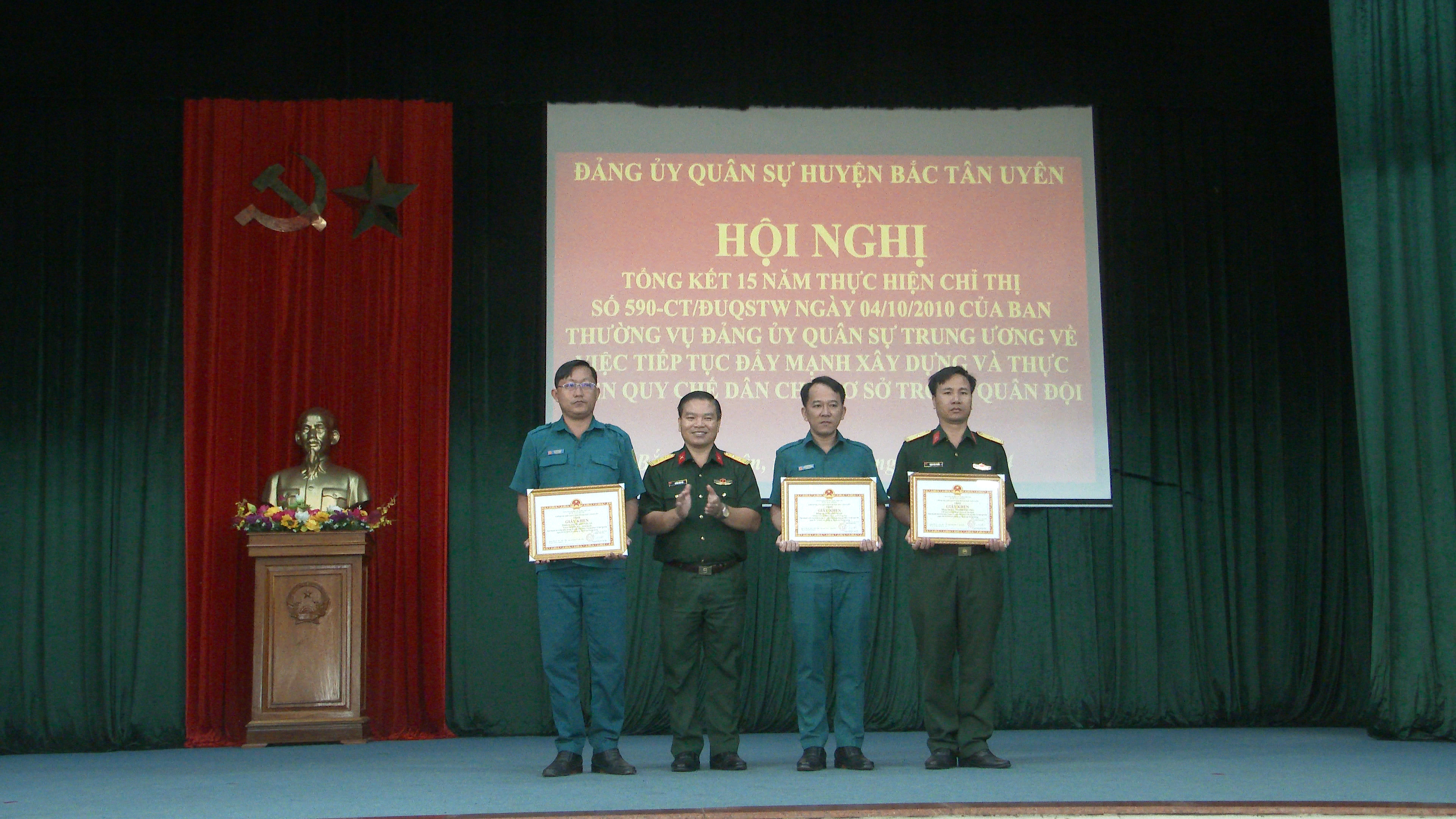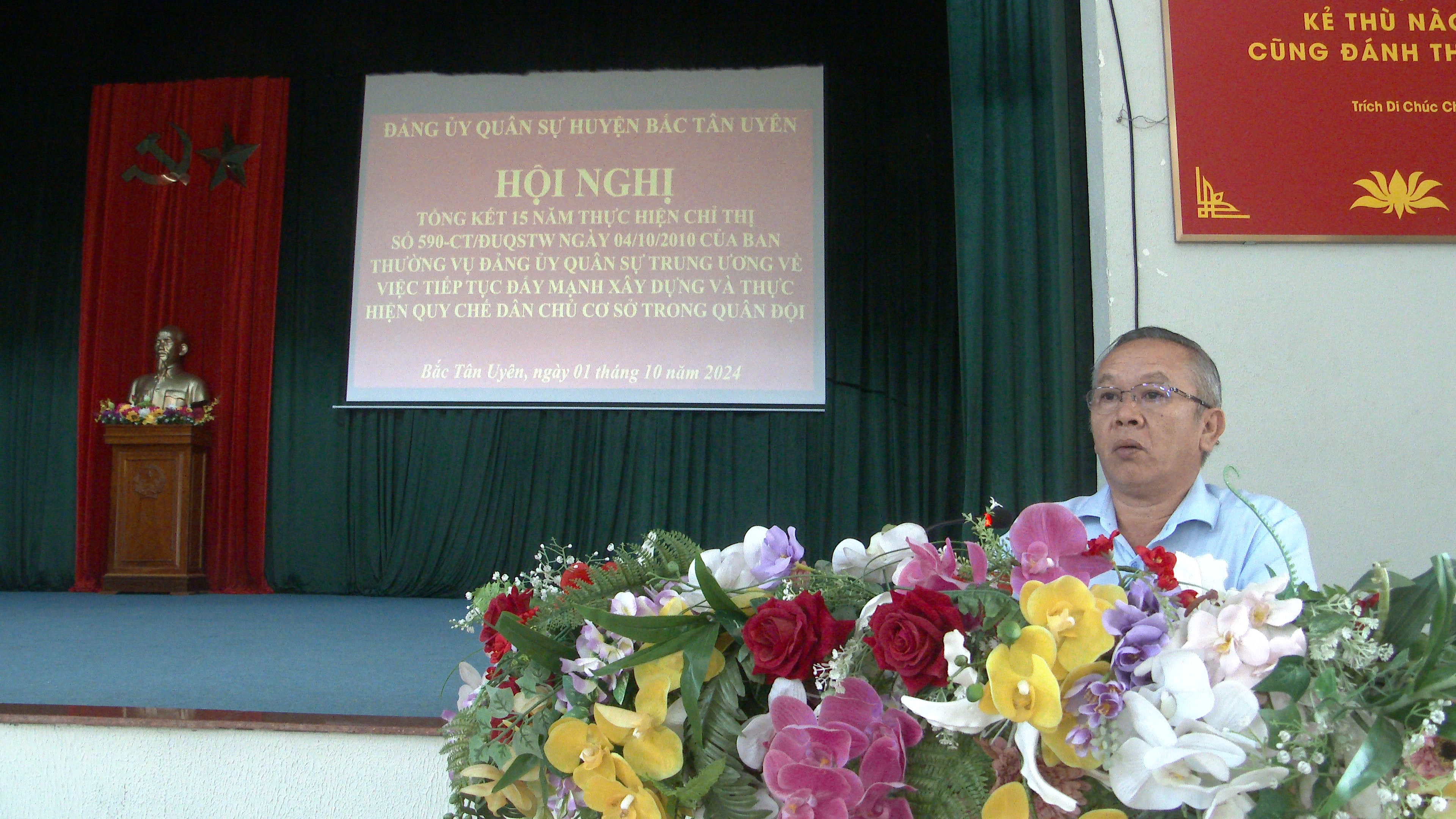 Sáng ngày 1/10, Đảng ủy quân sự huyện Bắc Tân Uyên tổ chức hội nghị tổng kết 15 năm thực hiện Chỉ thị số 590, ngày 4/10/2010 của Thường vụ Đảng ủy quân sự Trung ương về tiếp tục đẩy mạnh xây dựng và thực hiện quy chế dân chủ cơ sở trong quân đội. Dự hội nghị có Đại tá Lê Minh Phương - Phó Chính ủy Bộ Chỉ huy quân sự tỉnh, đồng chí Thái Thanh Bình - Tỉnh ủy viên - Bí thư Huyện ủy, Bí thư Đảng ủy quân sự huyện, đồng chí Phạm Văn An - Uỷ viên thường vụ Huyện uỷ -Trưởng ban Dân vận Huyện ủy; các đồng chí trong Đảng ủy quân sự huyện; lãnh đạo Đảng ủy, Ban chỉ huy quân sự các xã, thị trấn.