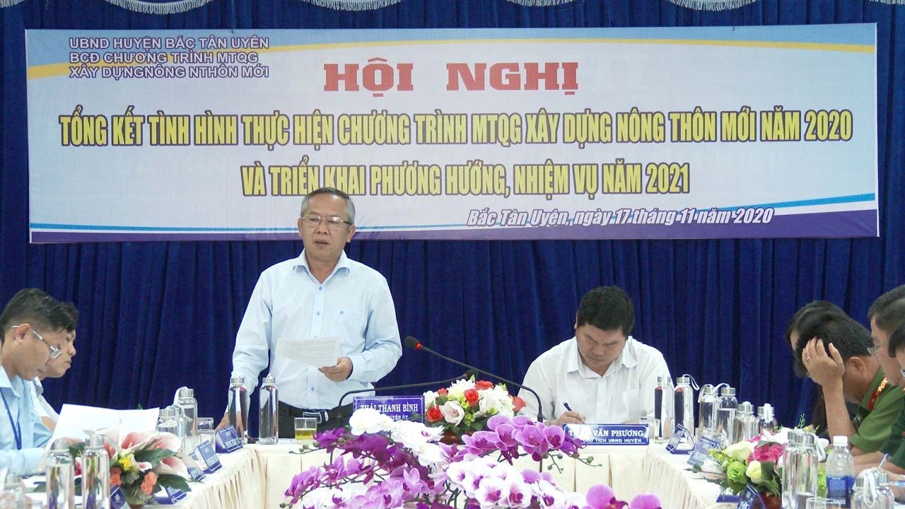 Sáng ngày 17/11, huyện Bắc Tân Uyên tổ chức hội nghị tổng kết Chương trình mục tiêu Quốc gia xây dựng nông thôn mới năm 2020, triển khai phương hướng nhiệm vụ năm 2021. Dự hội nghị có ông Thái Thanh Bình - Tỉnh ủy viên - Bí thư Huyện ủy - Chủ tịch UBND huyện - Trưởng ban chỉ đạo Chương trình mục tiêu Quốc gia xây dựng nông thôn mới huyện, lãnh đạo các ban, ngành, đoàn thể huyện, Chủ tịch UBND các xã, thị trấn trên địa bàn huyện.