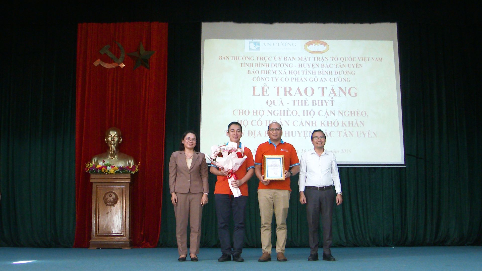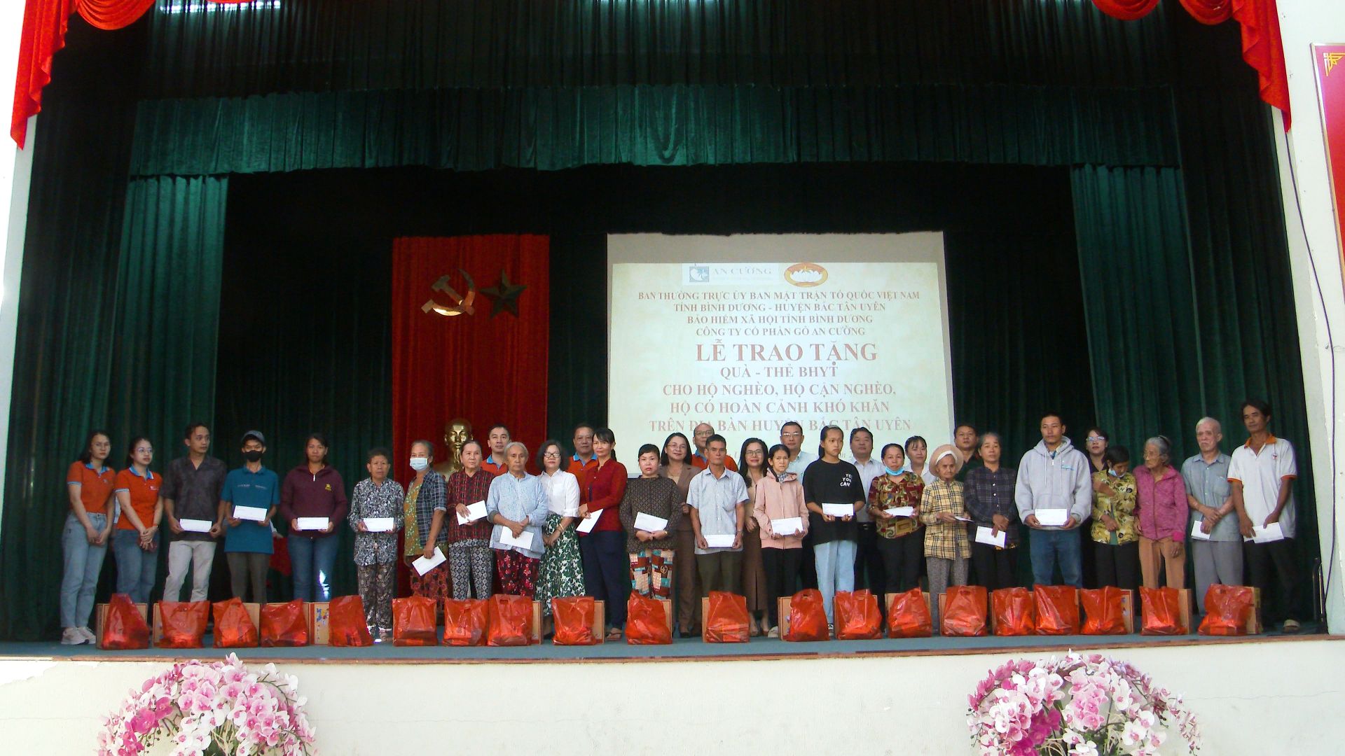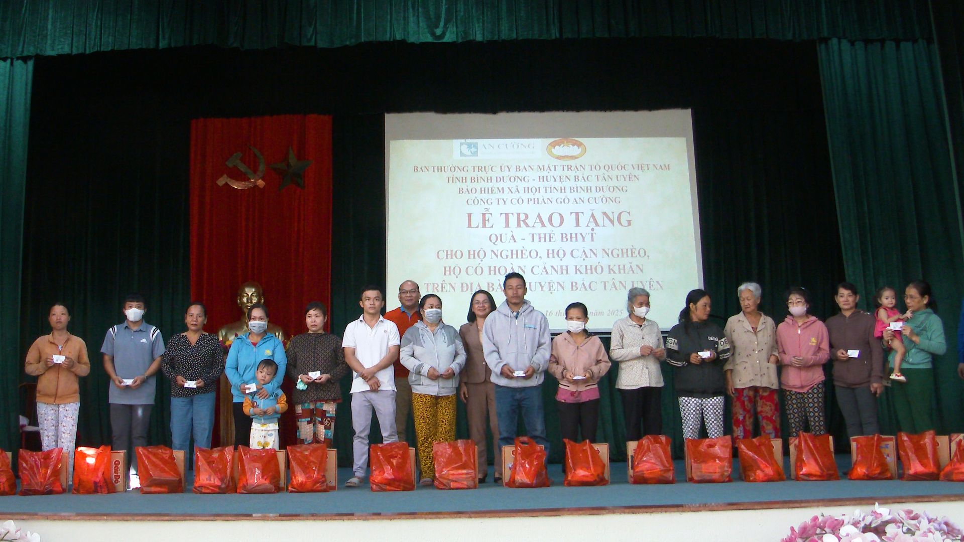 Sáng ngày 16/1, Ủy ban Mặt trận Tổ Quốc Việt Nam huyện Bắc Tân Uyên phối hợp Ban vận động Quỹ Vì người nghèo tỉnh Bình Dương, Ban vận động Quỹ Vì người nghèo huyện tổ chức chương trình trao tặng quà tết và thẻ bảo hiểm y tế cho hộ nghèo, hộ cận nghèo, hộ có hoàn cảnh khó khăn trên địa bàn huyện. Đến dự chương trình có bà Lê Thị Hoa-Ủy viên Ban thường vụ Tỉnh ủy-Trưởng Ban phong trào Ủy ban MTTQ Việt Nam tỉnh, bà Phạm Thị Hương Tuyền-Phó Giám đốc Bảo hiểm xã hội tỉnh, ông Trần Văn Phương-Ủy viên ban Thường vụ Huyện ủy-Phó Chủ tịch UBND huyện, bà Lê Huỳnh Lê-Ủy viên ban Thường vụ Huyện ủy-Chủ tịch Ủy ban MTTQ Việt Nam huyện; Ban giám đốc, nhân viên Công ty Cổ phần Gỗ An Cường, các hộ nghèo, hộ cận nghèo, hộ có hoàn cảnh khó khăn trên địa bàn huyện.