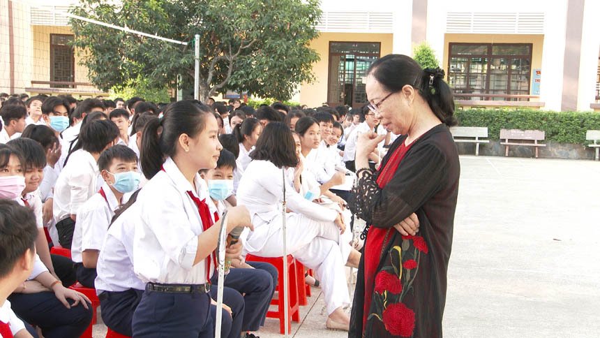 Bà La Thị Hai - Phó Chủ tịch Hội KHHGĐ tỉnh Bình Dương truyền thông chăm sóc sức khỏe sinh sản cho học sinh trường THPT Lê Lợi