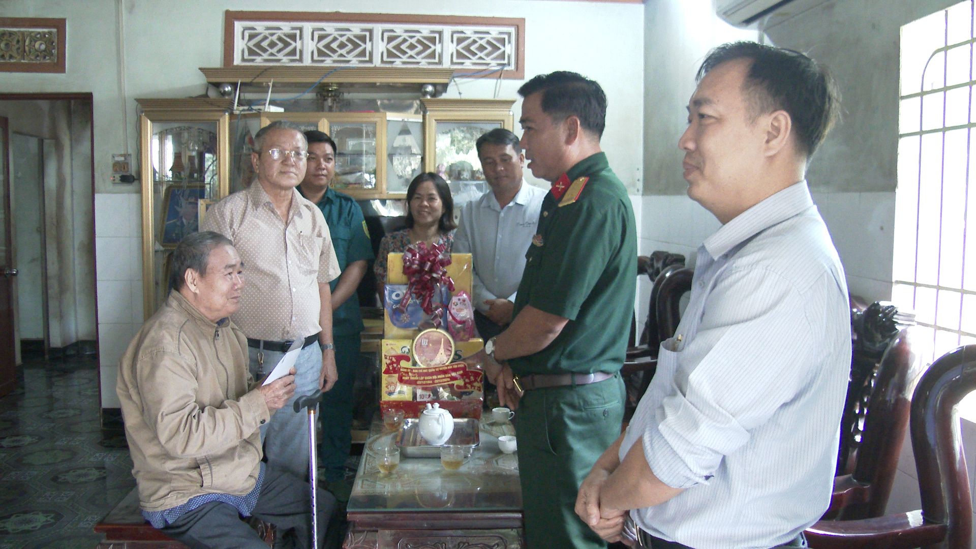 Theo đó, Đoàn đã đến thăm, tặng quà Mẹ Việt Nam anh hùng Đoàn Thị Chèo, khu phố Cổng Xanh, thị trấn Tân Bình và chú Nguyễn Thanh Xuân thương binh 2/4, bệnh binh 3/4, ngụ ấp Mỹ Đức, xã Bình Mỹ. Tại mỗi nơi đến, thay mặt đoàn, Thượng tá Lê Văn Toàn - Ủy viên Thường vụ Huyện ủy - Chỉ huy trưởng Ban Chỉ huy Quân sự huyện đã ân cần hỏi thăm sức khỏe, đời sống sinh hoạt, lao động sản xuất, đồng thời bày tỏ lòng biết ơn sâu sắc đối với những đóng góp của các thế hệ đi trước trong sự nghiệp đấu tranh giải phóng dân tộc và bảo vệ Tổ quốc, luôn là tấm gương sáng, tích cực tuyên truyền vận động con cháu, nhân dân thực hiện tốt các chủ trương của Đảng, chính sách, pháp luật của Nhà nước; mong muốn gia đình tiếp tục phát huy truyền thống cách mạng, đóng góp vào sự phát triển của quê hương và là những tấm gương sáng cho thế hệ trẻ noi theo. Đồng thời trao tặng mỗi gia đình một phần quà trị giá 500 ngàn đồng và 2 triệu đồng tiền mặt.