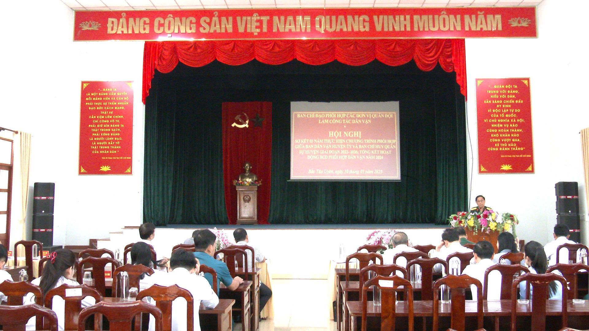 Sáng ngày 10/1, tại Ban Chỉ huy (BCH) Quân sự huyện, Ban Dân vận Huyện uỷ và BCH Quân sự huyện Bắc Tân Uyên tổ chức hội nghị sơ kết 3 năm thực hiện chương trình phối hợp giữa Ban Dân vận Huyện uỷ và BCH Quân sự huyện giai đoạn 2022 – 2026 và tổng kết hoạt động Ban chỉ đạo phối hợp dân vận. Dự hội nghị có Đại tá Lê Minh Phương – Phó Chính uỷ Bộ Chỉ huy Quân sự tỉnh Bình Dương; đồng chí Phạm Văn An – Uỷ viên Ban Thường vụ Huyện uỷ, Trưởng Ban Dân vận Huyện uỷ; Trung tá Huỳnh Văn Tân – Chính trị viên BCH Quân sự huyện, đại diện lãnh đạo các đơn vị Quân đội đứng chân trên địa bàn; các cơ quan, ban, ngành đoàn thể huyện, lãnh đạo các xã, thị trấn.