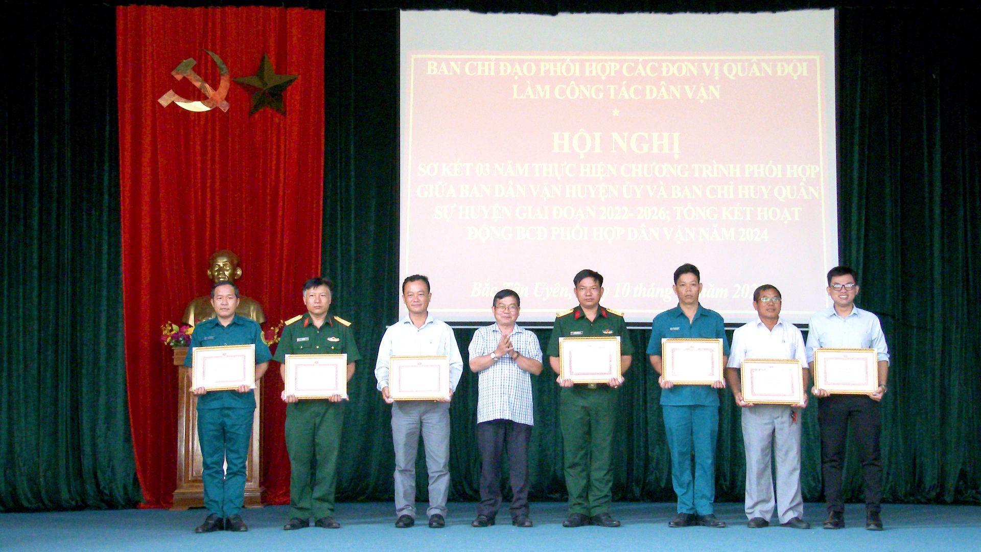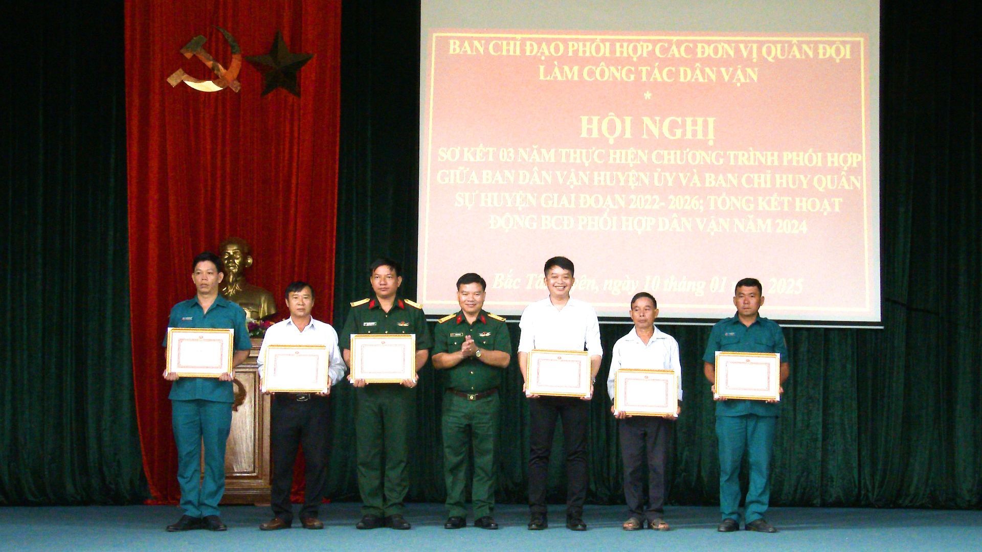 Tại hội nghị, đồng chí Phạm Văn An – Uỷ viên Ban Thường vụ, Trưởng ban Dân vận Huyện uỷ và Trung tá Huỳnh Văn Tân – Chính trị viên Ban BCH Quân sự huyện đã trao giấy khen cho các tập thể và cá nhân có thành tích xuất sắc trong thực hiện công tác phối hợp các đơn vị quân đội làm công tác dân vận giai đoạn 2022-2024.