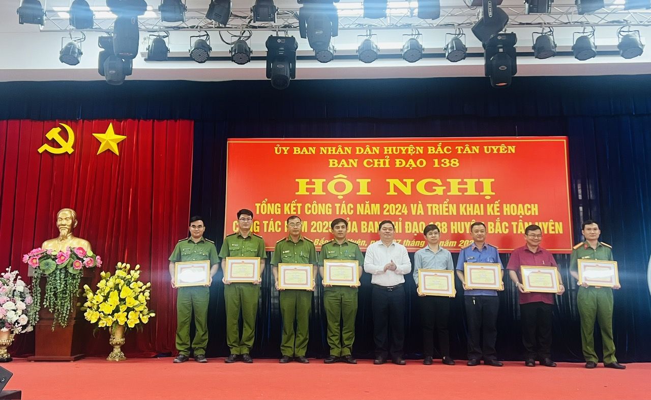 Sáng 27/12, Ban chỉ đạo Phòng, chống tội phạm, tệ nạn xã hội và xây dựng phong trào toàn dân bảo vệ an ninh Tổ quốc (gọi tắt là BCĐ 138) huyện Bắc Tân Uyên tổ chức hội nghị tổng kết công tác năm 2024 và triển khai phương hướng, nhiệm vụ năm 2025. Dự hội nghị có ông Trần Văn Phương - UVTV Huyện uỷ, PCT.UBND huyện, Trưởng BCĐ; ông Phạm Văn An - UVTV Huyện uỷ, Trưởng Ban Dân vận huyện uỷ; Thượng tá Hồ Hoàng Thanh - Phó trưởng Công an huyện; các thành viên BCĐ huyện cùng lãnh đạo, cán bộ, chiến sĩ các đội nghiệp vụ công an huyện; lãnh đạo UBND và Công an các xã, thị trấn.