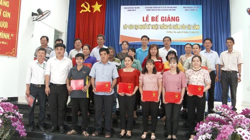 Sáng ngày 8-12, Phòng Kinh tế huyện Bắc Tân Uyên phối hợp cùng Trường Trung cấp Nông lâm nghiệp Bình Dương và UBND xã Thường Tân tổ chức lễ bế giảng lớp đào tạo nghề kỹ thuật trồng và chăm sóc cây cảnh.