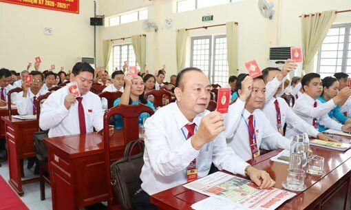 Các đại biểu biểu quyết thông qua Nghị quyết Đại hội Đảng bộ huyện Bắc Tân Uyên nhiệm kỳ 2020-2025.