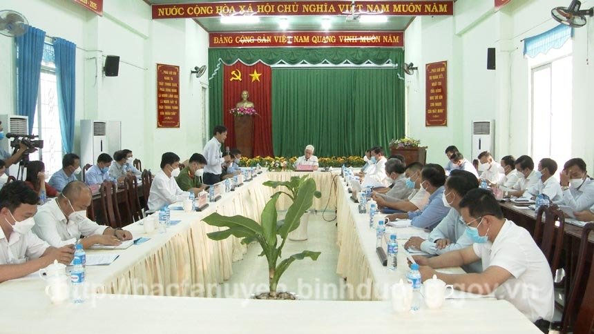 Báo cáo với Đoàn, lãnh đạo huyện cho biết trong tuần qua toàn huyện có 850 ca nhiễm Covid-19 nâng tổng số ca mắc Covid-19 trong toàn huyện đến nay là 7.368 ca. Hiện nay đang cách ly điều trị tại nhà 1.374 ca và 13 ca đang cách ly điều trị tại Trung tâm Y tế huyện. Đánh giá cấp độ dịch toàn huyện đạt cấp độ 1.