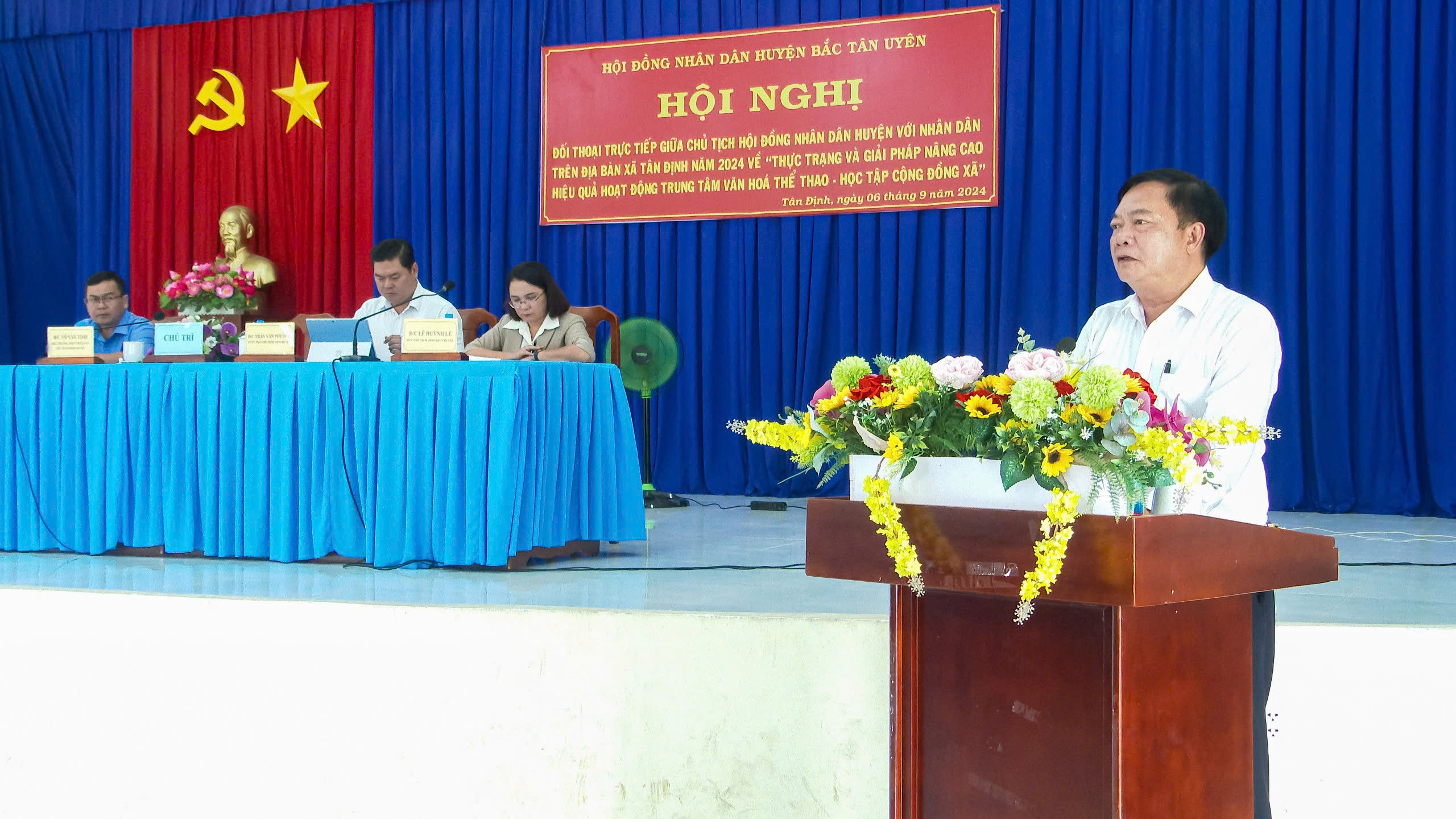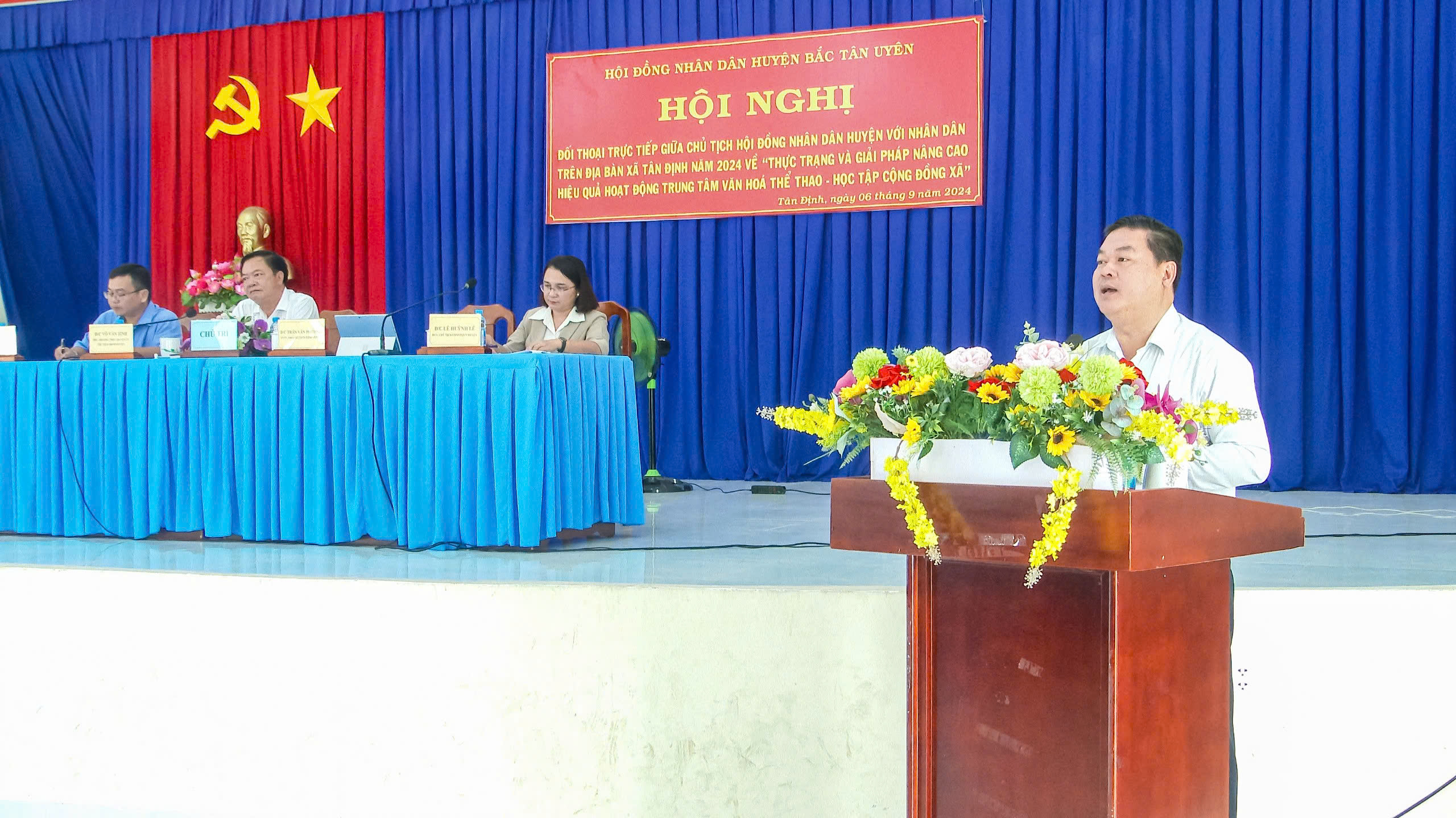 Sáng ngày 06/9, ông Võ Văn Tính - Phó Bí thư Thường trực Huyện ủy, Chủ tịch HĐND huyện Bắc Tân Uyên đã có buổi đối thoại trực tiếp với nhân dân xã Tân Định về thực trạng và giải pháp nâng cao hiệu quả hoạt động Trung tâm Văn hóa - Thể thao và Học tập cộng đồng xã. Dự Hội nghị đối thoại còn có ông Phạm Văn An - UVTV Huyện uỷ, Trưởng Ban Dân vận Huyện ủy; ông Trần Văn Phương - UVTV Huyện ủy, PCT UBND huyện; bà Lê Huỳnh Lê - Huyện uỷ viên, Chủ tịch UBMTTQVN huyện; đại diện lãnh đạo các cơ quan ban ngành huyện; lãnh đạo UBND cùng đông đảo bà con nhân dân xã Tân Định đang quan tâm lĩnh vực hoạt động Trung tâm Văn hóa - Thể thao và Học tập cộng đồng xã của địa phương đến tham dự và cho ý kiến.