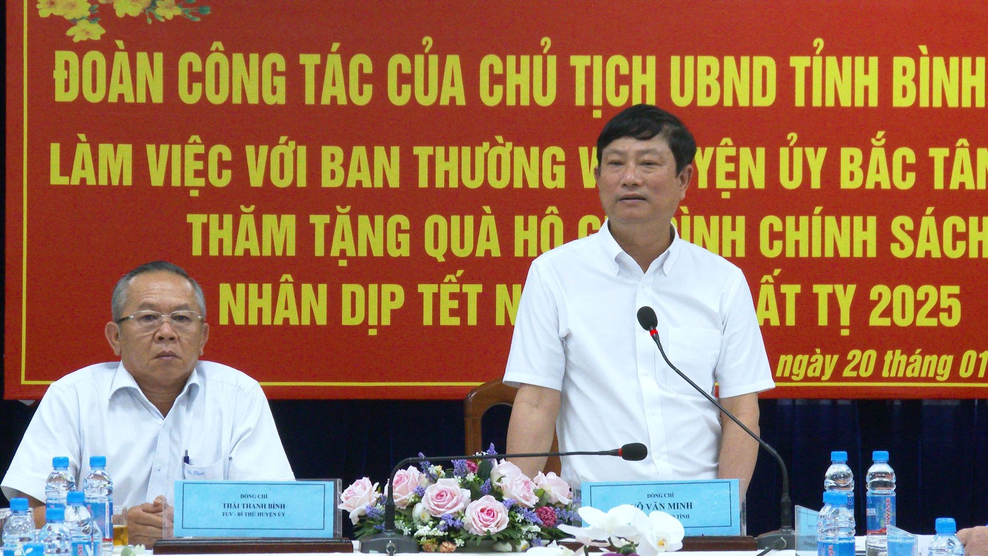 Phát biểu tại buổi làm việc, ông Võ Văn Minh - Phó Bí thư Tỉnh ủy - Chủ tịch UBND tỉnh đánh giá cao những kết quả nổi bật mà huyện Bắc Tân Uyên đã đạt được trong thời gian qua, đồng thời yêu cầu huyện Bắc Tân Uyên tiếp tục phát huy tiềm năng thế mạnh, tập trung thực hiện thắng lợi các mục tiêu nhiệm vụ quan trọng. Huyện cần khẩn trương triển khai thực hiện quy hoạch phát triển đô thị đối với 4 xã đã được chọn. Trên cơ sở Đồ án Quy hoạch xây dựng vùng huyện Bắc Tân Uyên đến năm 2040 đã được UBND tỉnh phê duyệt, huyện cần xác định danh danh mục trọng điểm cần ưu tiên phát triển; chủ động mời gọi, thu hút nhà đầu tư nhằm đẩy nhanh tốc độ phát triển kinh tế - xã hội của địa phương. Tiếp tục phối hợp với các cơ quan, ban, ngành của tỉnh tập trung triển khai thực hiện quyết liệt các công trình trọng điểm trên địa bàn huyện, nhằm thúc đẩy địa phương phát triển theo hướng xanh, thân thiện môi trường; ngang tầm với các địa phương khác trên địa bàn tỉnh…