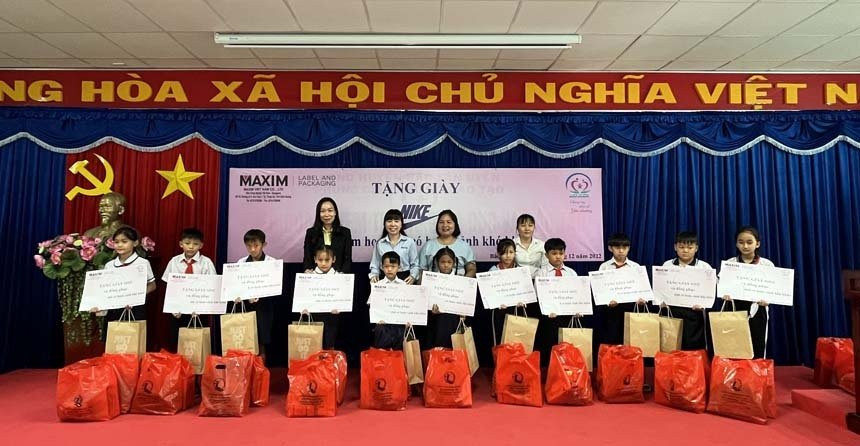 Phối hợp với Quỹ Bảo trợ trẻ em tỉnh Bình Dương, Công ty TNHH Nhãn mác và Bao bì Maxim Việt Nam trao tặng giày cho 15 học sinh có hoàn cảnh khó khăn với tổng trị giá 30 triệu đồng (2 triệu đồng/đôi giày và 200.000 đồng tiền mặt).