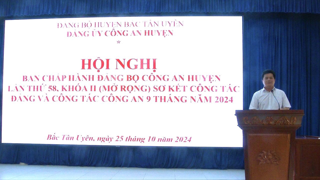 Đảng bộ Công an huyện Bắc Tân Uyên vừa tổ chức Hội nghị Ban Chấp hành lần thứ 58, khóa II (mở rộng); sơ kết công tác 9 tháng và triển khai nhiệm vụ 3 tháng cuối năm 2024. Tham dự hội nghị có Đ/c Nguyễn Thành Thường - Phó Bí thư Huyện ủy, Chủ tịch UBND huyện; Thượng tá Võ Thành Trung - UVTV Huyện ủy, Trưởng Công an huyện chủ trì hội nghị.