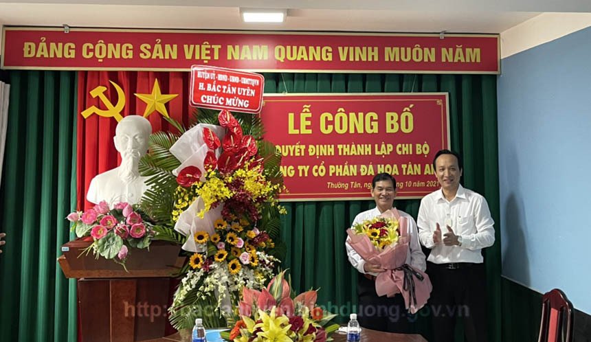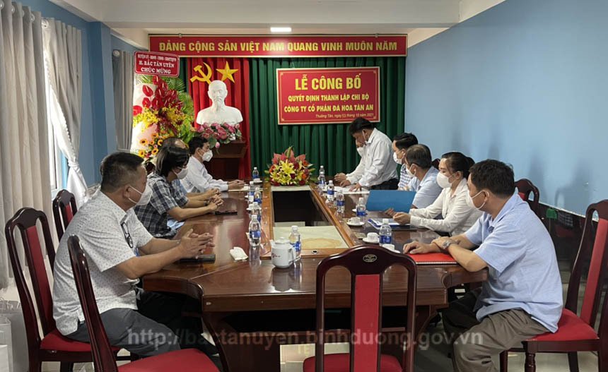 Sáng ngày 13-10, tại Công ty Cổ phần Đá Hoa Tân An thuộc địa bàn ấp 3, xã Thường Tân, Ban Thường vụ Huyện ủy Bắc Tân Uyên tổ chức Lễ công bố quyết định thành lập Chi bộ Công ty Cổ phần Đá Hoa Tân An trực thuộc Huyện ủy. Dự buổi lễ có Đ/c Trương Văn Phong - Phó Bí thư Huyện ủy, Đ/c Nguyễn Thanh Lâm - UVTV, Trưởng Ban Tổ chức Huyện ủy, đại diện lãnh đạo Văn phòng Huyện ủy và lãnh đạo Ban Tổ chức Huyện ủy; Đ/c Hà Huy Khánh - Tổng Giám đốc Công ty và các đồng chí trong Ban Giám đốc Công ty, Chủ tịch Công đoàn Công ty.