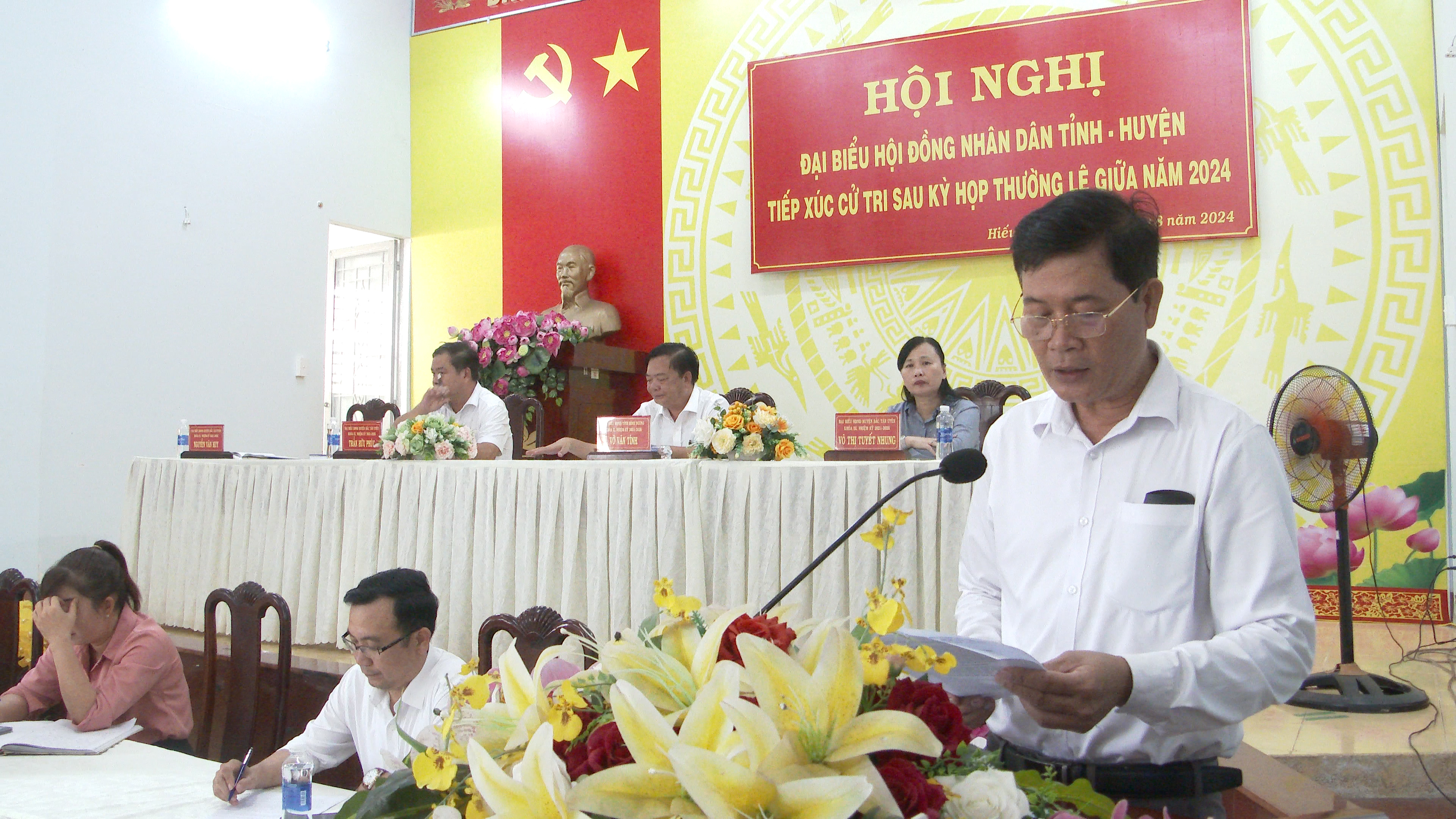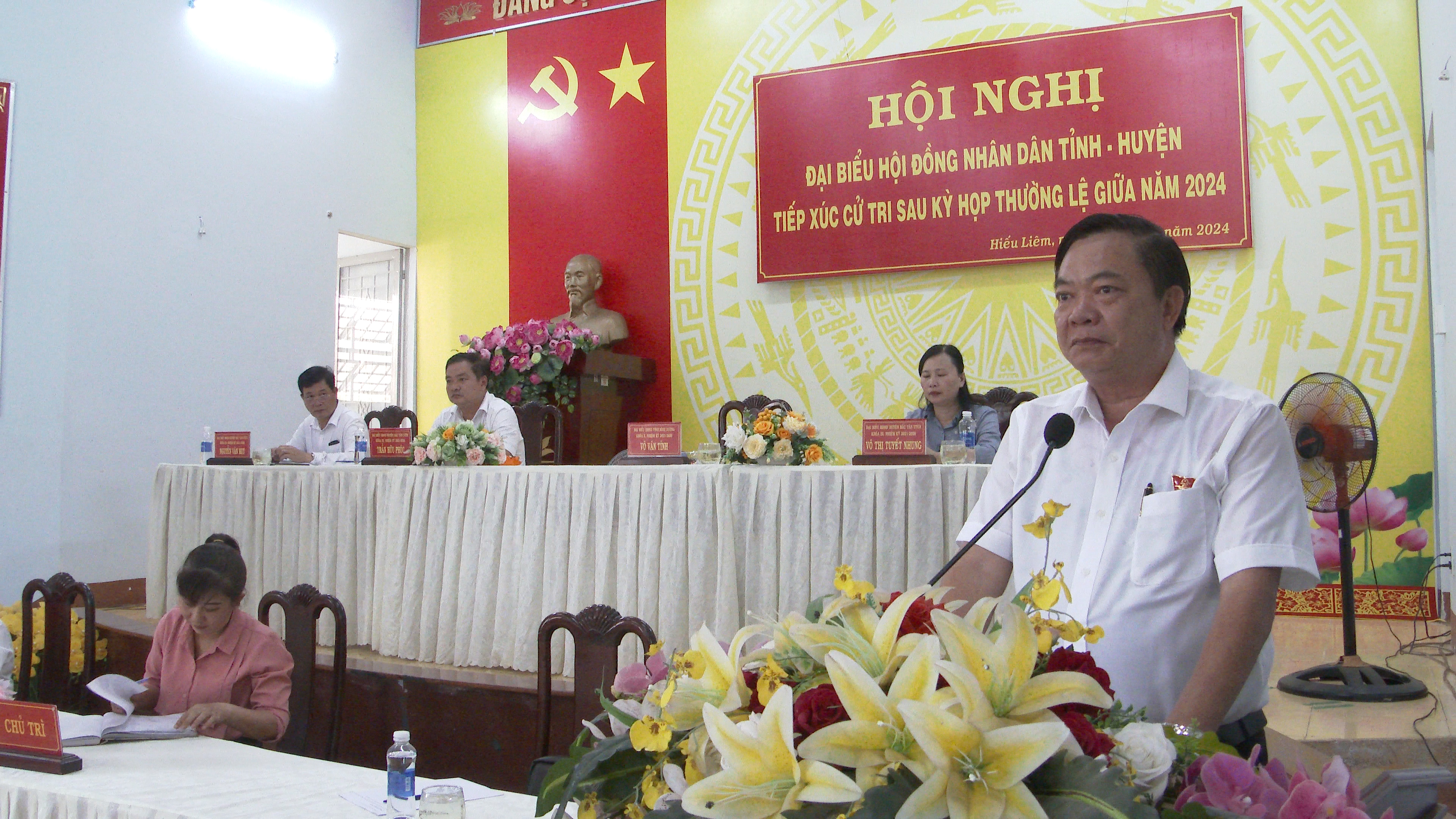 Kết thúc buổi tiếp xúc cử tri, ông Võ Văn Tính - Phó Bí thư Thường trực Huyện ủy, Chủ tịch HĐND huyện, đại biểu HĐND tỉnh cũng đã thông tin đến cử tri một số nội dung nổi bật về tình hình kinh tế - xã hội của địa phương. Đồng thời, đề nghị UBND 2 xã Tân Định, Hiếu Liêm và các ngành, các cấp, các địa phương, cơ quan, đơn vị cần tập trung thực hiện tốt các nhiệm vụ trong tâm, tiếp tục phát huy những kết quả đạt được thời gian qua, phát huy hơn nữa tinh thần đoàn kết, trách nhiệm để hoàn thành thắng lợi các mục tiêu, nhiệm vụ phát triển KT-XH, đảm bảo QPAN năm 2024.