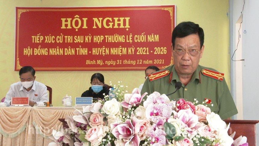 Ông Nguyễn Văn Dựt – Tỉnh Ủy viên, Phó Giám đốc Công an tỉnh Bình Dương đại biểu HĐND tỉnh thông tin đến cử tri kết quả kỳ họp cuối năm 2021 HĐND tỉnh và huyện tại buổi tiếp xúc cử tri thị trấn Tân Bình, xã Bình Mỹ