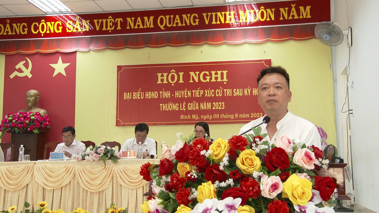 Tại buổi tiếp xúc, sau khi nghe đại biểu HĐND tỉnh-huyện báo cáo kết quả kỳ họp HĐND tỉnh-huyện giữa năm và trả lời các ý kiến, kiến nghị của cử tri trong lần tiếp xúc trước kỳ họp, cử tri cũng phản ánh một số ý kiến, kiến nghị liên quan đến việc giải quyết hồ sơ chế độ chính sách cho người nghỉ hưu theo chế độ; việc nâng cấp đường điện trên địa bàn xã Bình Mỹ; công tác bảo dưỡng, đảm bảo an toàn hệ thống điện, lưới điện của ngành điện; tình trạng xe quá khổ, quá tải, chạy quá tốc độ trên tuyến đường ĐT.747; sớm đầu tư hệ thống cống dọc trên tuyến đường ĐT.747 đoạn ấp Mỹ Đức, xã Bình Mỹ; tình trạng mua bán, kinh doanh lấn chiếm lề đường gây mất an toàn giao thông; việc tách thửa đất để thực hiện quyền thừa kế cho con; công tác quản lý đất nghĩa địa trên địa bàn xã Bình Mỹ.