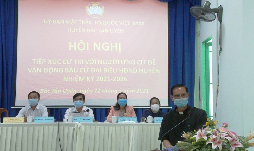 Ông Nguyễn Thế Trường - Linh mục Nhà thờ Tân Lậptrình bày chương trình hành động của cá nhân người ứng cử đại biểu HĐND huyện, nhiệm kỳ 2021-2026