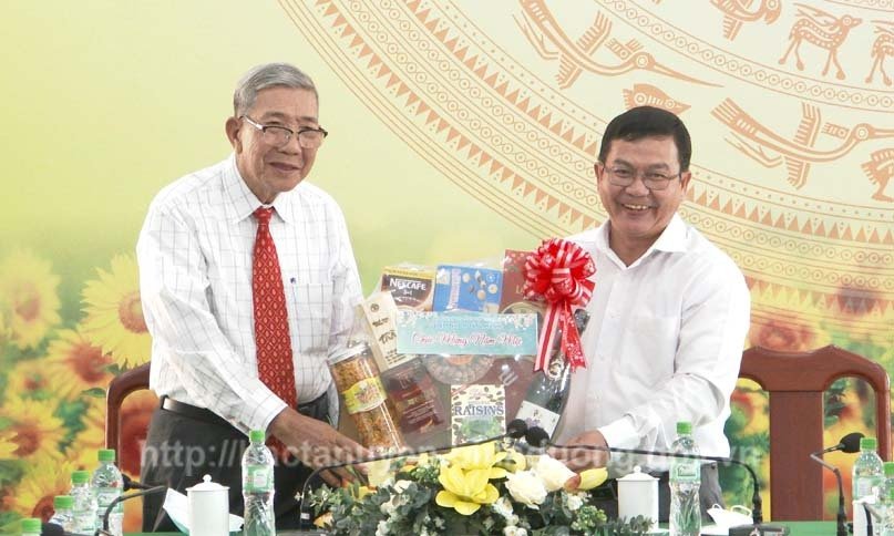 Mục sư Trần Văn Hiền (bên trái) tặng quà chúc tết đến Huyện ủy-HĐND-UBND-UBMTTQVN huyện