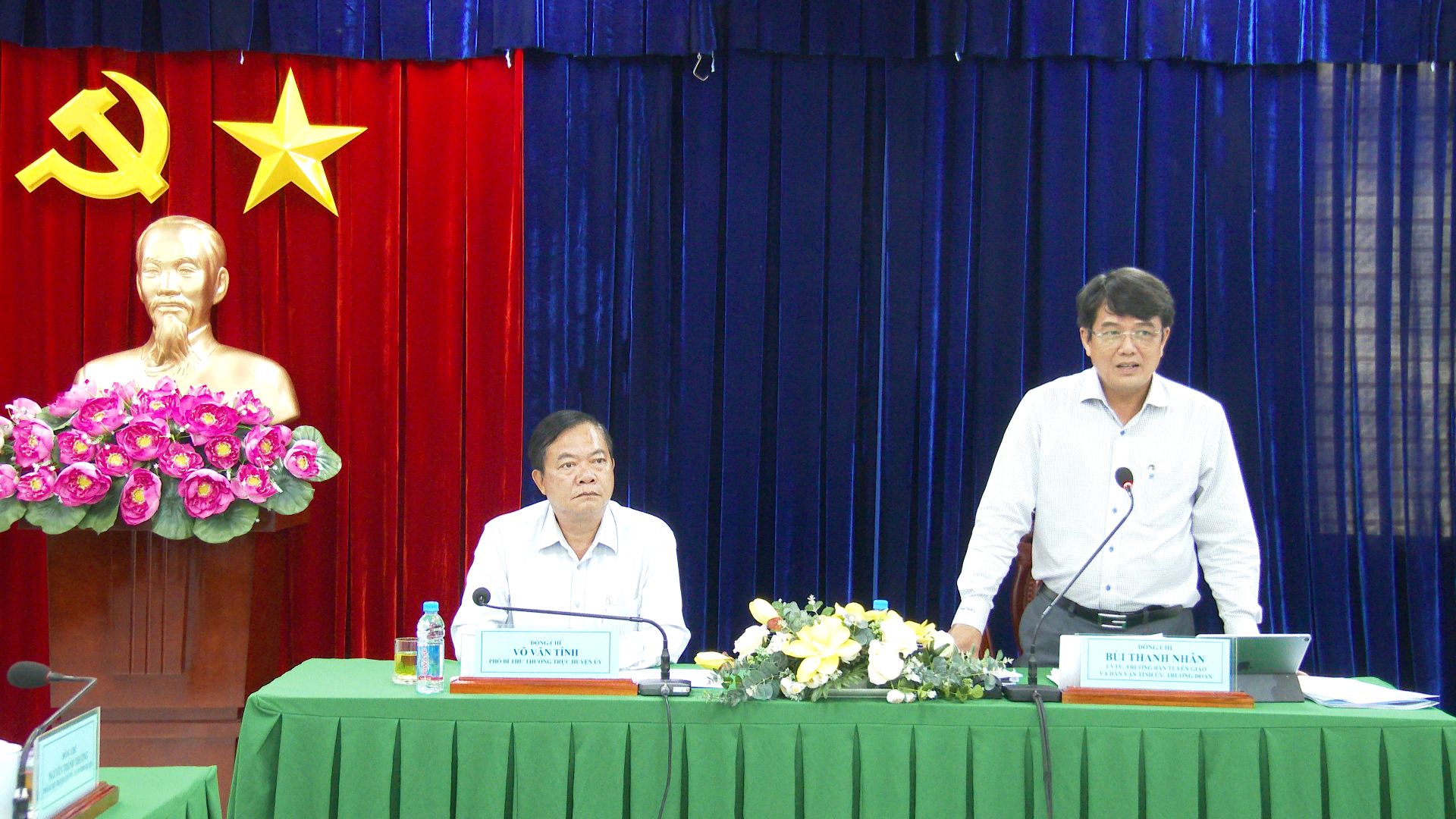 Đồng chí Bùi Thanh Nhân - Ủy viên Ban Thường vụ tỉnh uỷ, Trưởng Ban Tuyên giáo và Dân vận Tỉnh ủy phát biểu tại buổi làm việc