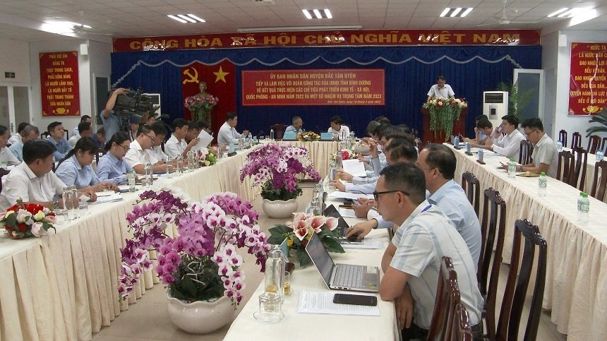 Chiều ngày 10/3,Đoàn lãnh đạo tỉnh do ông Võ Văn Minh- Phó Bí thư Tỉnh ủy, Chủ tịch UBND tỉnhBình Dương làm Trưởng đoàn đã có buổi làm việc với UBND huyện Bắc Tân Uyên về kếtquả thực hiện các chỉ tiêu phát triển kinh tế - xã hội, quốc phòng - an ninhnăm 2022, nhiệm vụ trọng tâm năm 2023. Tiếp vào làm việc với đoàn có ông TháiThanh Bình- Bí thư Huyện ủy, Chủ tịch UBND huyện cùng lãnh đạo các phòng, banchuyên môn UBND huyện và 10 xã, thị trấn.