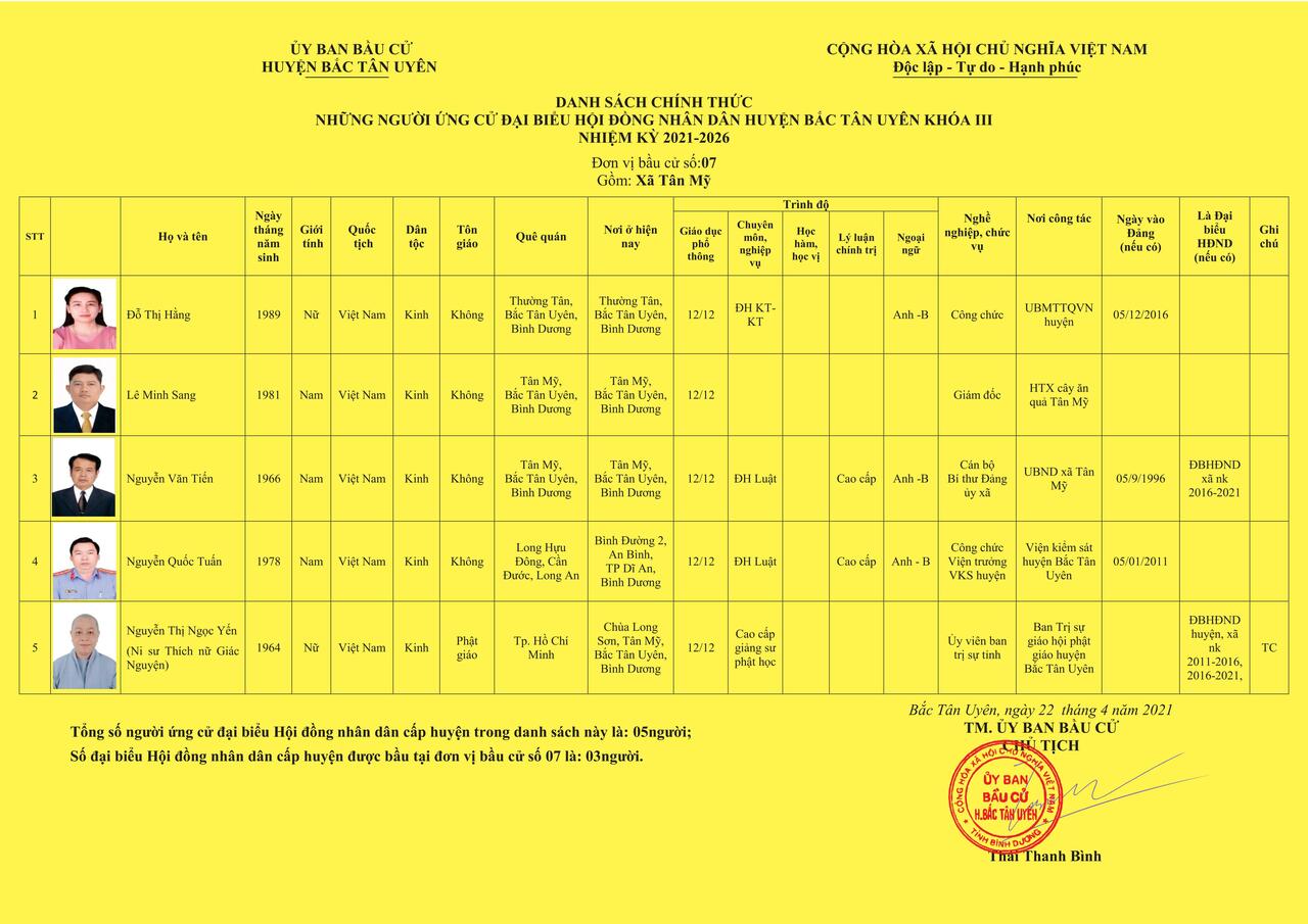 Đơn vị bầu cử số 7 - Bầu cử đại biểu Hội đồng nhân dân huyện Bắc Tân Uyên khóa III, nhiệm kỳ 2021 - 2026