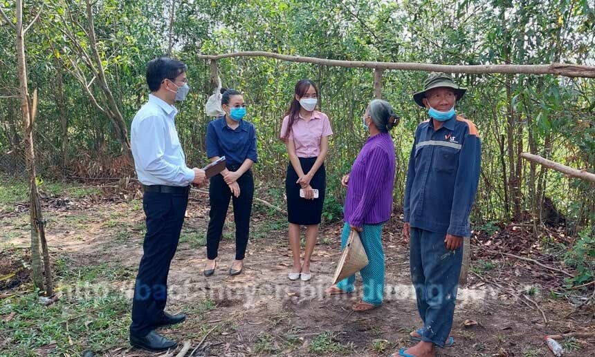 Anh Nguyễn Hùng Sơn – Phó giám đốc Ngân hàng Chính sách xã hội huyện (bìa trái) đi kiểm tra thực tế tại hộ chăn nuôi trâu của gia đình chị Liên