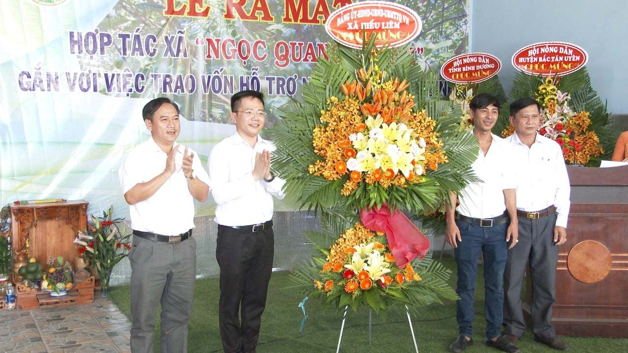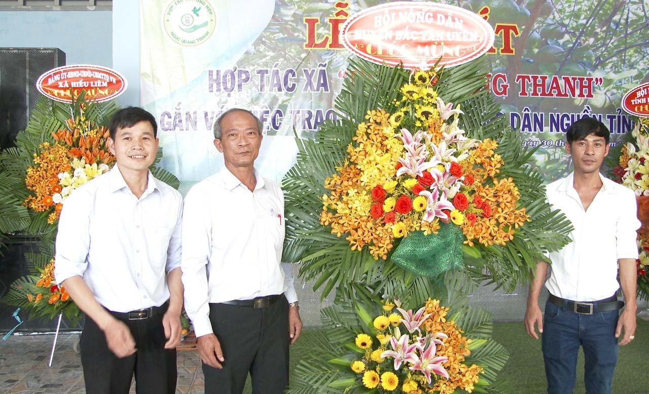 Lãnh đạo Hội nông dân huyện, lãnh đạo xã Hiếu Liêm tặng hoa chúc mừng HTX