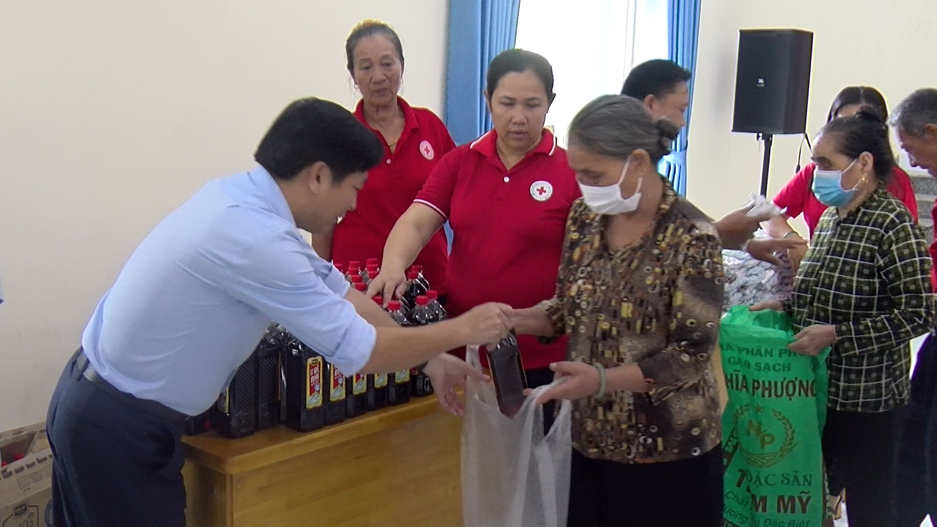 Lãnh đạo xã trao quà cho người dân khó khăn