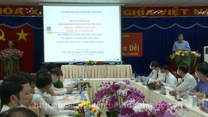 Chiều ngày 24-11, Hội đồng nhân dân huyện Bắc Tân Uyên khóa III, nhiệm kỳ 2021-2026 đã tổ chức kỳ họp thứ ba (chuyên đề), để xem xét Tờ trình thông qua Quy hoạch sử dụng đất đến năm 2030, Kế hoạch sử dụng đất năm 2021 huyện Bắc Tân Uyên và thông qua dự thảo Nghị quyết Quy hoạch sử dụng đất đến năm 2030, Kế hoạch sử dụng đất năm 2021 huyện Bắc Tân Uyên. Dự kỳ họp có đồng chí Thái Thanh Bình – Tỉnh Ủy viên, Bí thư Huyện ủy, Chủ tịch UBND huyện, cùng các vị đại biểu HĐND huyện, các đồng chí thành viên UBND huyện và đại diện lãnh đạo UBND các xã, thị trấn. Đồng chí Võ Văn Tính - Phó Bí thư Thường trực Huyện ủy, Chủ tịch HĐND huyện chủ trì kỳ họp.
