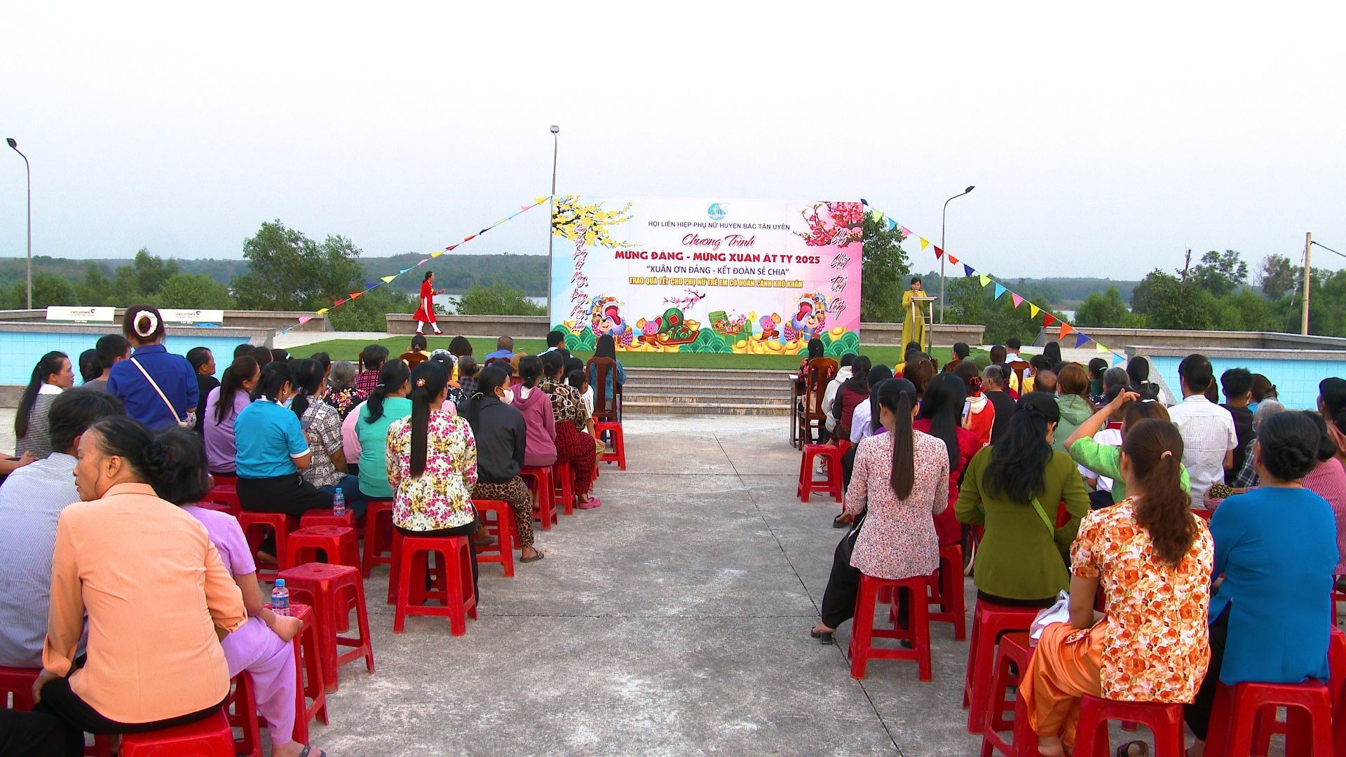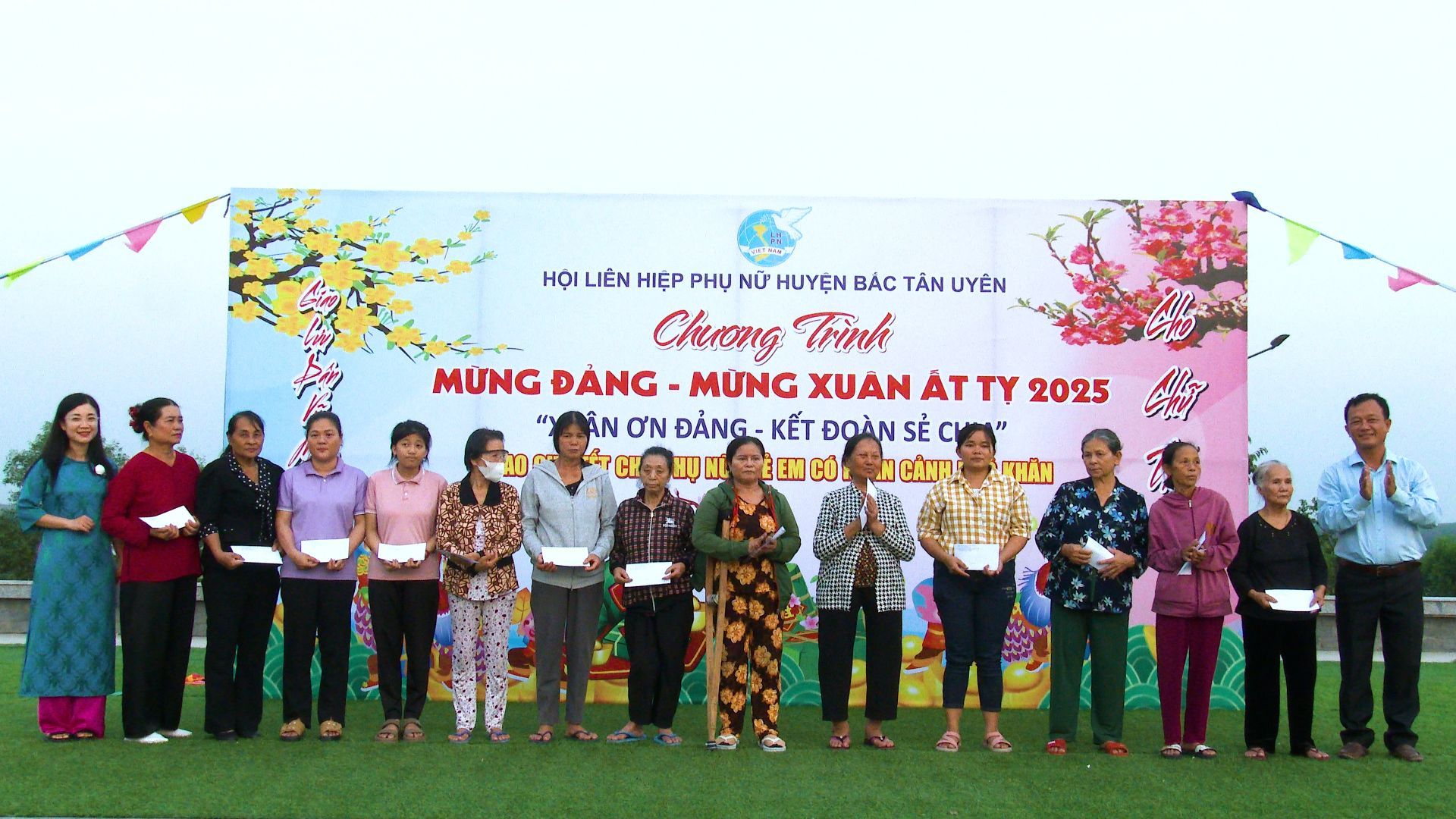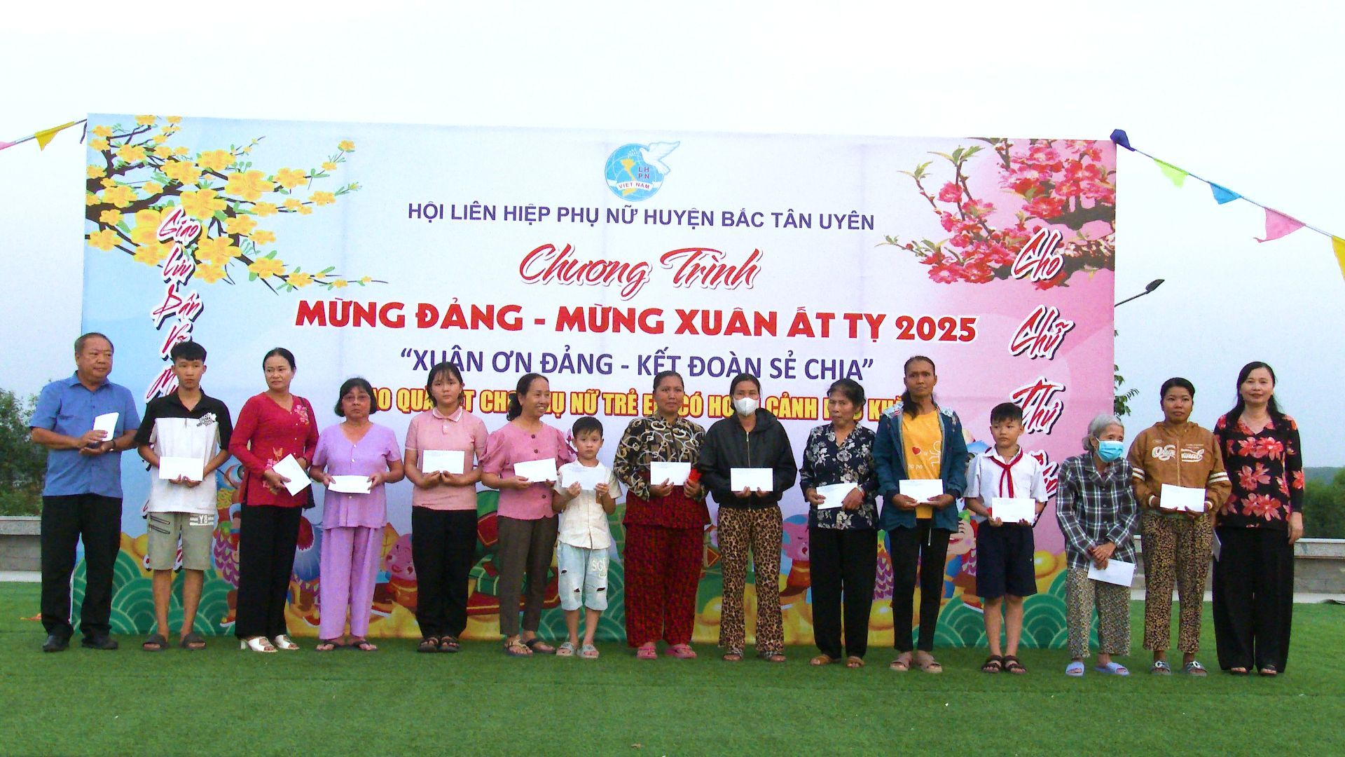 Chiều tối ngày 25-1 tại Quảng trường Trung tâm hành chính huyện, Hội LHPN huyện Bắc Tân Uyên tổ chức các hoạt động mừng Đảng, mừng Xuân Ất Tỵ năm 2025, với Chủ đề: “Xuân ơn Đảng-Đoàn kết sẻ chia”. Tham dự chương trình có bà Trần Thị Bích Thủy - Trưởng ban Gia đình Xã hội hội LHPN tỉnh; ông Lê Văn Hưng - HUV Phó Trưởng Ban Dân vận Huyện ủy; bà Võ Thị Tuyết Nhung - HUV, Chủ tịch hội LHPN huyện cùng đại diện lãnh đạo các cơ quan, ban, ngành, đoàn thể huyện và hơn 100 hội viên phụ nữ có hoàn cảnh khó khăn trên địa bàn huyện.