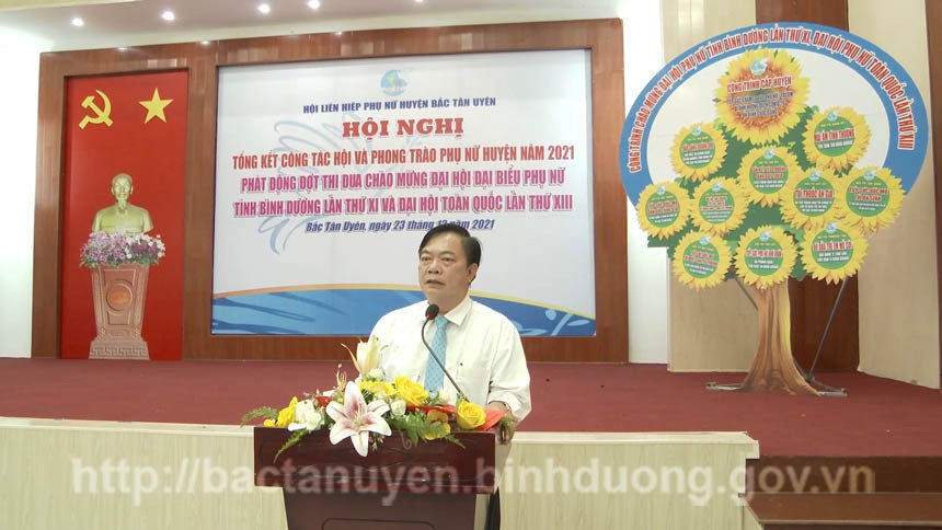 Phát biểu tại Hội nghị, đồng chí Võ Văn Tính - Phó Bí thư Thường trực Huyện ủy, Chủ tịch HĐND huyện ghi nhận thành tựu trong công tác Hội, phong trào phụ nữ năm 2021. Mặc dù tình hình dịch Covid-19 diễn biến phức tạp nhưng các cấp hội đã năng động, sáng tạo, đổi mới trong nội dung và phương thức hoạt động, từ trực tiếp sang trực tuyến để kịp tiến độ tổ chức Đại hội Hội LHPN ở cơ sở cũng như cấp huyện. Đồng thời, đồng chí Võ Văn Tính đề nghị trong thời gian tới Hội LHPN huyện và cơ sở quan tâm thực hiện những nội dung như: xây dựng, ban hành các chương trình, kế hoạch để thực hiện Nghị quyết Đại hội Đại biểu Phụ nữ huyện Bắc Tân Uyên lần thứ III, nhiệm kỳ 2021 – 2026; tập trung công tác tuyên truyền chủ trương, đường lối của Đảng, chính sách pháp luật của Nhà nước, nhất là qua mạng xã hội facebook, zalo; tiếp tục tổ chức và nâng cao chất lượng các phong trào thi đua, các cuộc vận động để phát huy tiềm năng sức sáng tạo của hội viên phụ nữ.