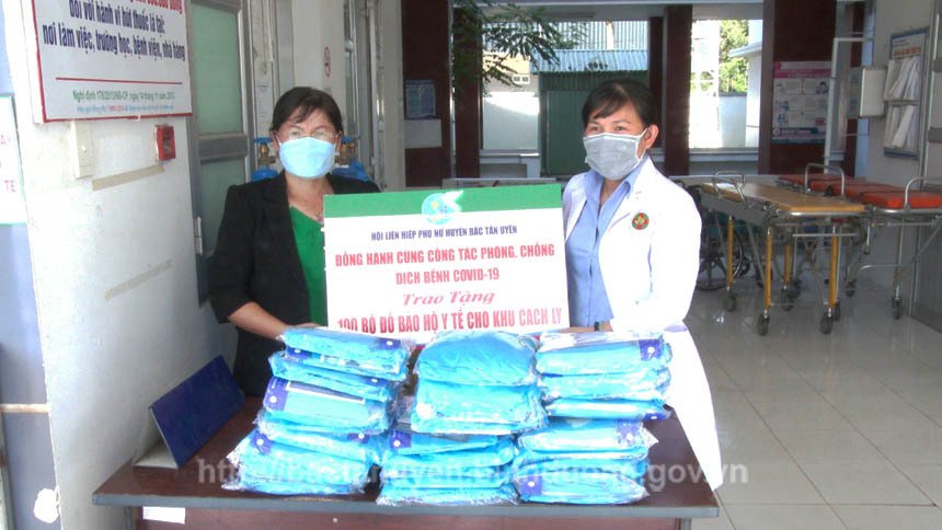 Ngoài ra vào chiều cùng ngày, Hội LHPN huyện đã gửi tặng 100 bộ đồ bảo hộ y tế cho Trung tâm Y tế huyện, góp phần cùng Ngành Y tế đảm bảo sự an toàn cho các lực lượng tham gia công tác phòng, chống dịch COVID-19 trên địa bàn huyện.