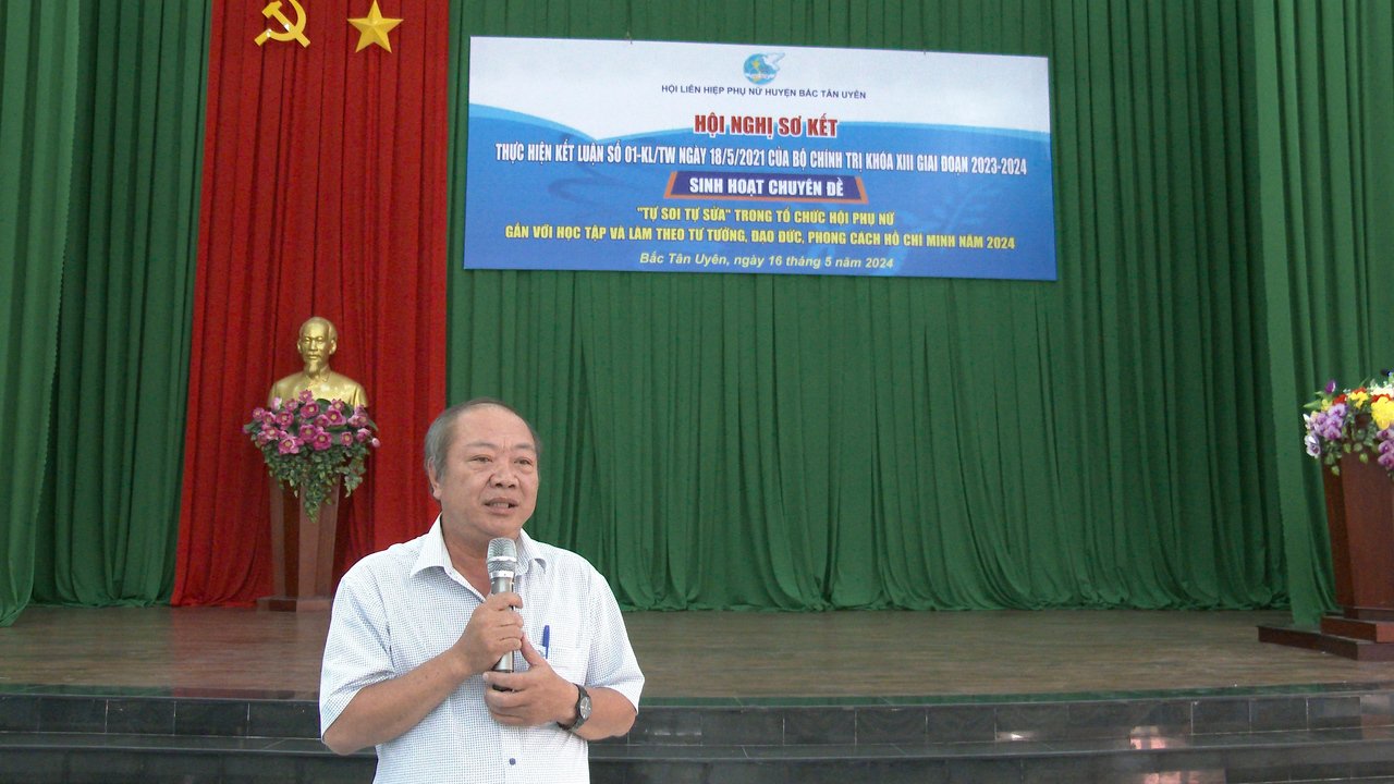 Sáng ngày 16/5, Hội Liên hiệp phụ nữ huyện Bắc Tân Uyên tổ chức hội nghị sơ kết thực hiện Kết luận 01, ngày 18/5/2021 của Bộ Chính trị về tiếp tục thực hiện Chỉ thị số 05 về đẩy mạnh học tập và làm theo tư tưởng, đạo đức, phong cách Hồ Chí Minh giai đoạn 2023-2024, sinh hoạt chuyên đề “Tự soi tự sửa” trong tổ chức hội phụ nữ gắn với học tập và làm theo tư tưởng, đạo đức, phong cách Hồ Chí Minh năm 2024. Tham dự hội nghị có đồng chí Ngô Phương Thanh-Phó Trưởng ban Tuyên giáo Huyện ủy, đồng chí Phan Thị Ngọc Lợi-HUV-Chủ tịch hội LHPN huyện; các dì, các chị là Chủ tịch, Phó Chủ tịch Hội LHPN xã, thị trấn, chi hội trưởng, chi hội phó, tổ trưởng, tổ phó các Tổ hội trên địa bàn huyện.