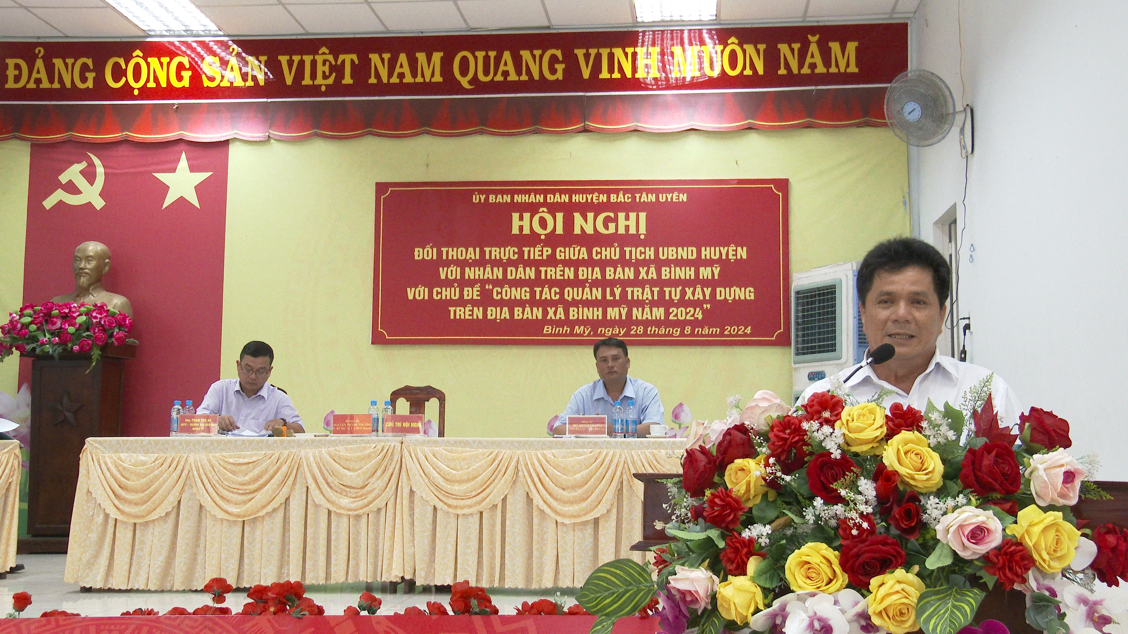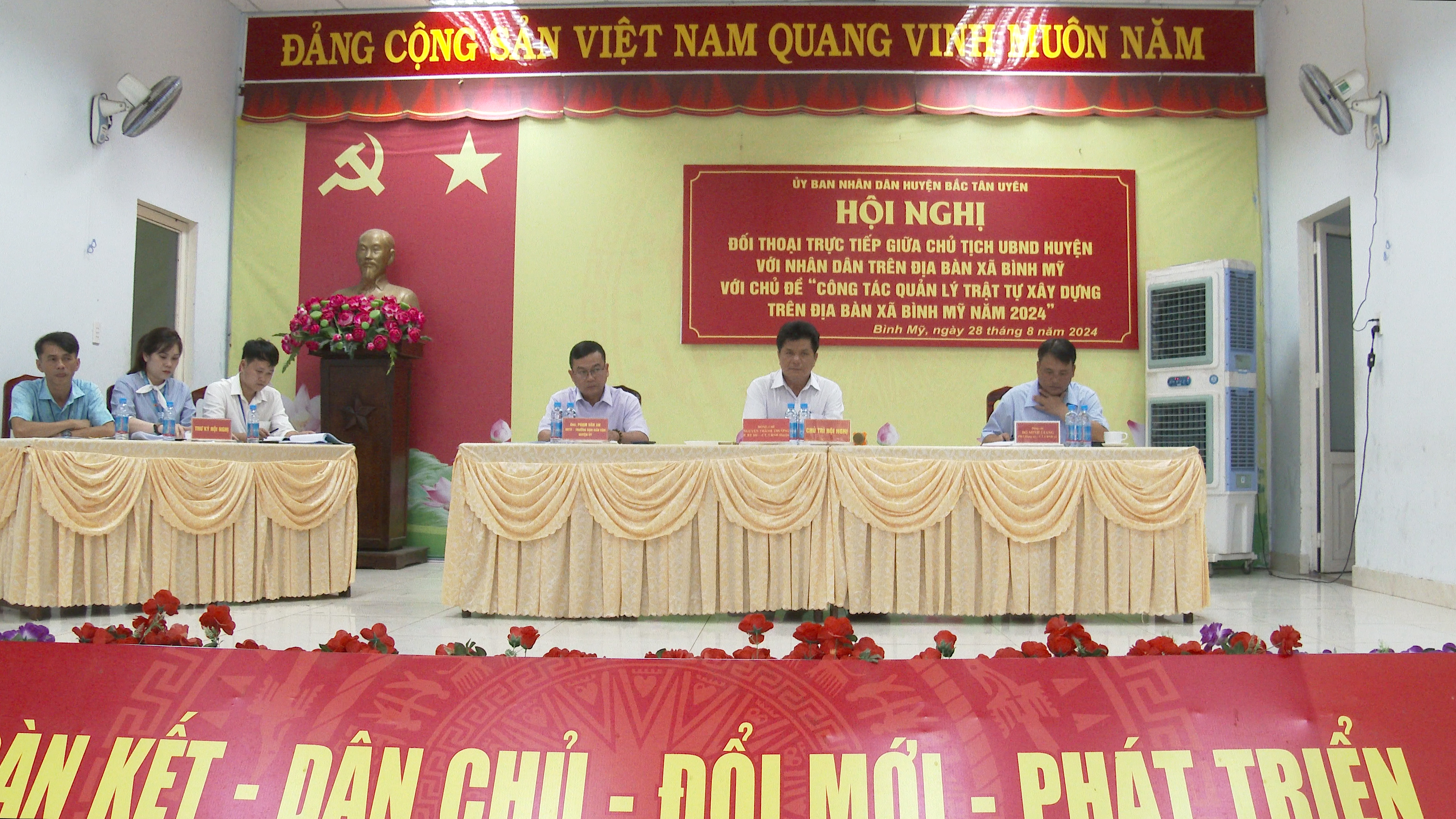 Chiều ngày 28/8, tại hội trường UBND xã Bình Mỹ, UBND huyện Bắc Tân Uyên tổ chức hội nghị đối thoại trực tiếp giữa Chủ tịch UBND huyện với nhân dân trên địa bàn xã Bình Mỹ với chủ đề Công tác quản lý trật tự xây dựng trên địa bàn xã Mình Mỹ năm 2024. Dự hội nghị có ông Võ Văn Tính - Phó Bí thư Thường trực Huyện ủy - Chủ tịch HĐND huyện, ông Nguyễn Thành Thường - Phó Bí thư Huyện ủy - Chủ tịch UBND huyện, ông Phạm Văn An - Ủy viên Thường vụ - Trưởng ban Dân vận Huyện ủy, ông Nguyễn Văn Thuận - Huyện ủy viên - Phó Chủ tịch UBND huyện, bà Võ Thị Tuyết Nhung - Huyện ủy viên - Phó Chủ tịch Ủy ban MTTQVN huyện, lãnh đạo các ngành, đoàn thể huyện; Chủ tịch, cán bộ phụ trách quản lý trật tự xây dựng các xã, thị trấn trên địa bàn huyện; Chủ tịch UBND, các ngành, đoàn thể, ban công tác mặt trận, ban điều hành và hơn 60 người dân của xã Bình Mỹ.